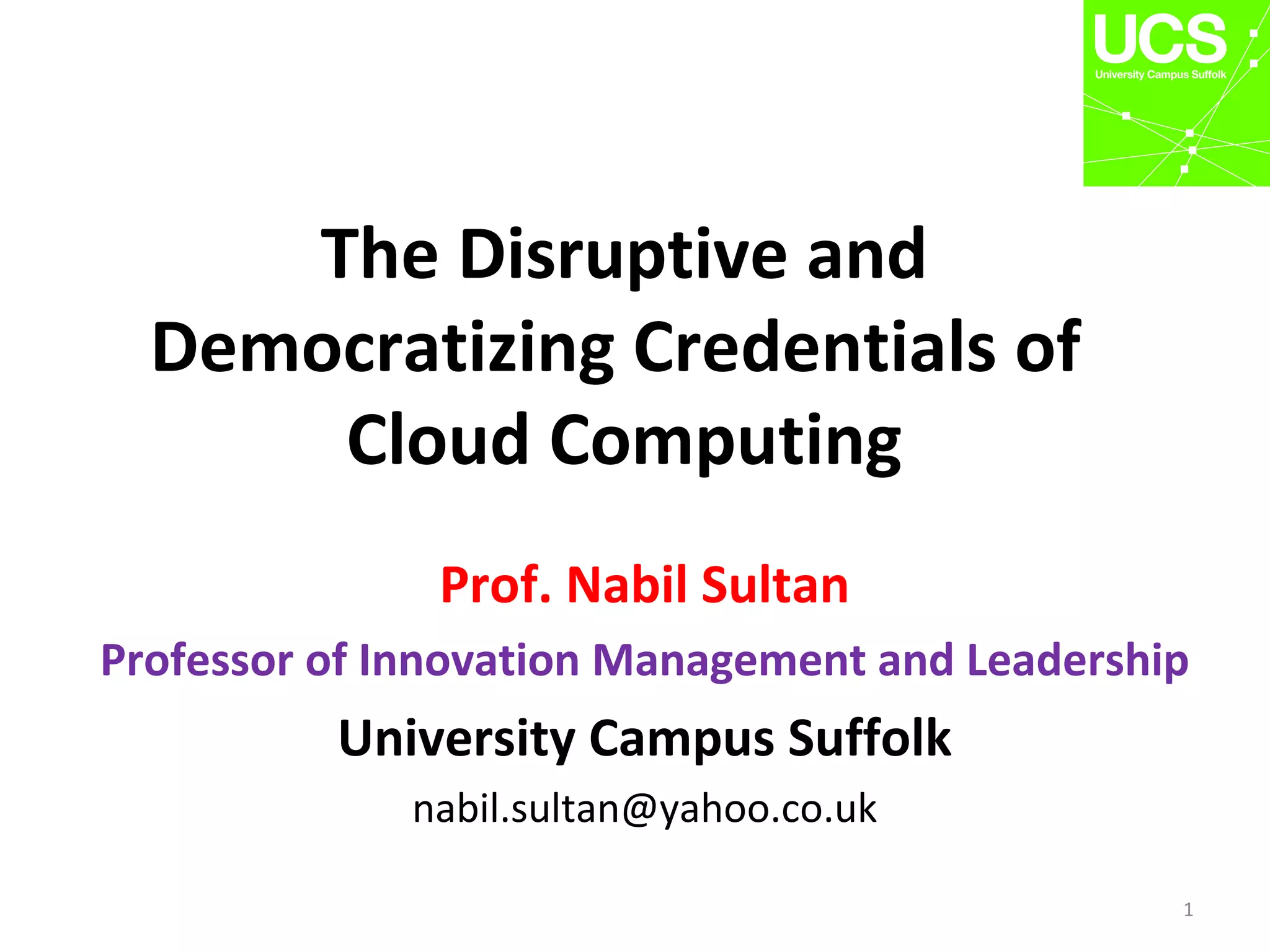The document discusses the concept and implications of cloud computing, highlighting its service models, benefits for small to medium enterprises (SMEs), and its potential to democratize access to IT resources in both developed and developing countries. It explains how cloud computing acts as a disruptive innovation that shifts traditional IT models, emphasizing its accessibility and cost-effectiveness. Additionally, it presents concerns regarding security and service reliability while illustrating the rapid increase of internet penetration and mobile technology in developing nations that may facilitate this democratization process.