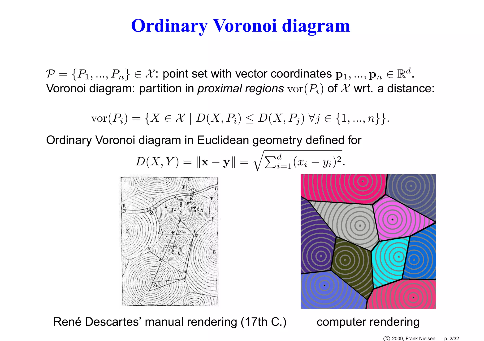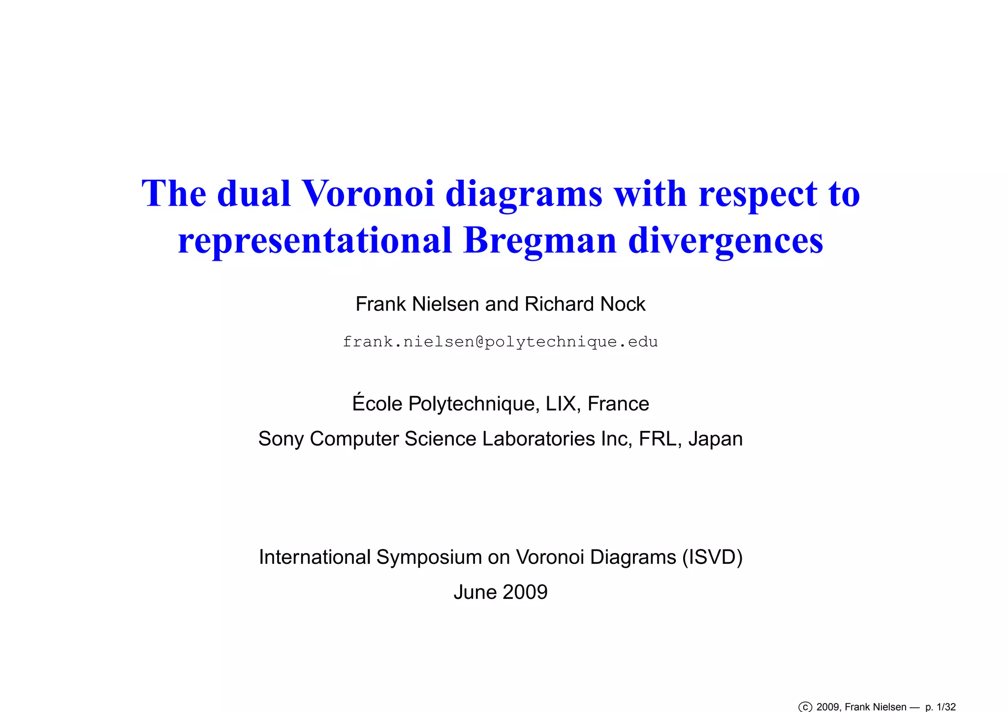 This document discusses Voronoi diagrams in various geometries beyond Euclidean space. It begins by introducing ordinary Voronoi diagrams based on Euclidean distance. It then discusses Voronoi diagrams in non-Euclidean geometries like spherical and hyperbolic spaces. It also discusses Voronoi diagrams in Riemannian geometries defined by a metric tensor, as well as information geometries based on probability distributions. The document introduces Bregman divergences and shows how Voronoi diagrams can be defined using these divergences in dually flat spaces. It specifically discusses α-divergences and β-divergences as examples of representational Bregman divergences. It concludes by discussing centroids