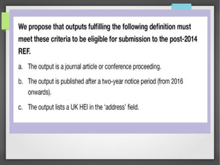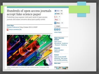 The document discusses the challenges and recommendations surrounding open access to academic research, particularly the transition from subscription journals to open access through article publication charges (APC). It highlights concerns about predatory publishers that exploit researchers and the evolving role of peer review in academic publishing, suggesting alternatives like open journal systems. The potential benefits of increased access to research for education are noted, along with the divisive implications of funding models across institutions.