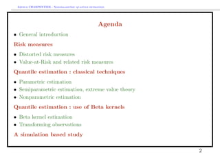 This document discusses quantile estimation techniques, including parametric, semiparametric, and nonparametric approaches. Parametric estimation assumes a distribution like Gaussian and estimates quantiles based on parameters of that distribution. Semiparametric estimation uses extreme value theory to model upper tails with a generalized Pareto distribution. Nonparametric estimation estimates quantiles directly from the data without assuming a particular distribution. The document presents several techniques for quantile estimation and compares their performance.