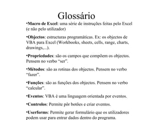 This document discusses various concepts in VBA macros including objects, properties, methods, functions, events, controls, userforms, variables, data types, arrays, procedures, functions, argument passing, and control structures like If/Then, Select Case, Do/While loops, For/Next loops, and For Each loops. It provides examples of how to declare and use these different programming elements in VBA macros.