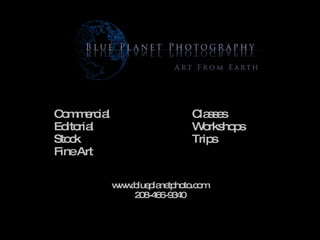 Blue Planet Photo is a photography business located in Idaho that offers commercial, editorial, and stock photography as well as fine art photography classes, workshops, and trips. The website is www.blueplanetphoto.com and the phone number is 208-466-9340.