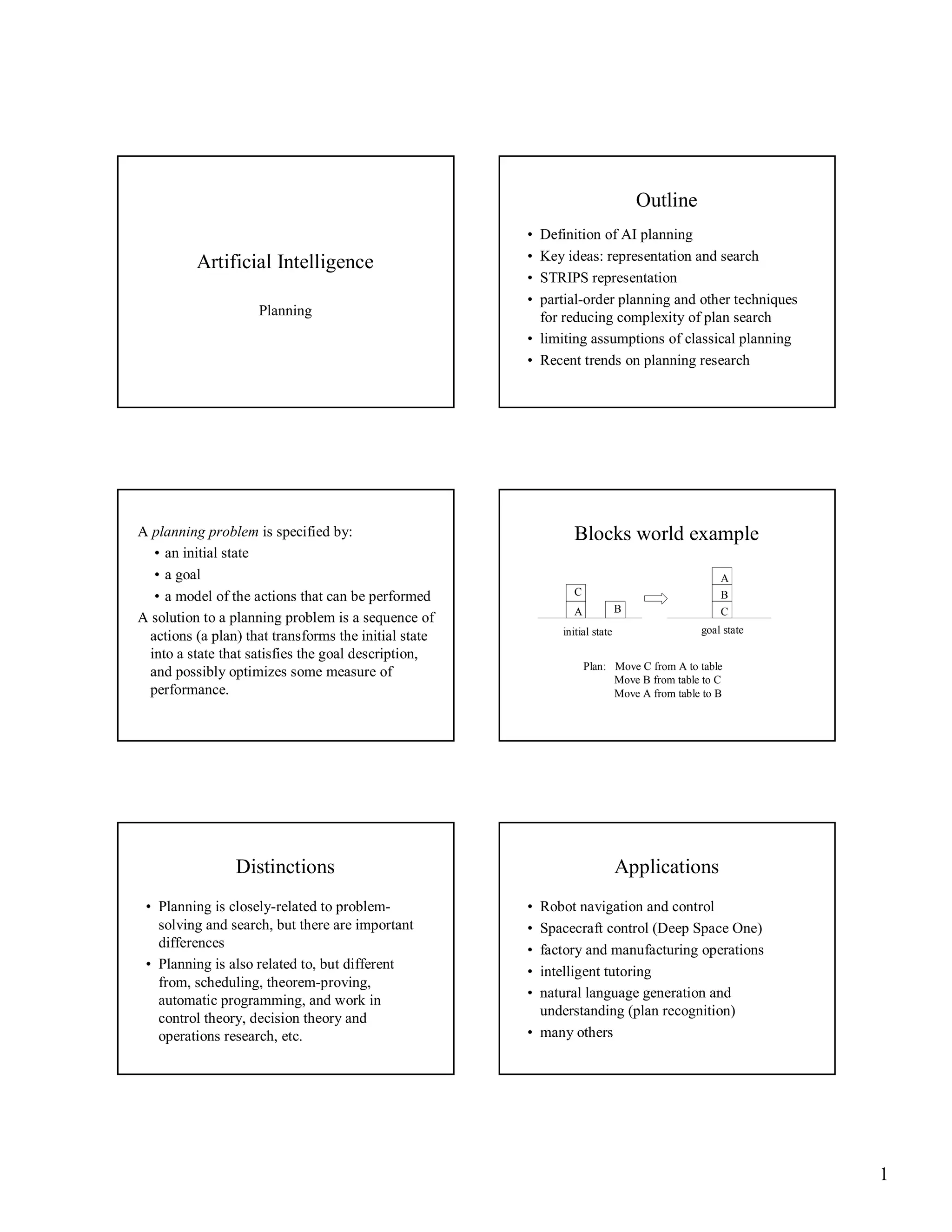 This document discusses artificial intelligence planning and summarizes key ideas in 3 sentences or less:
