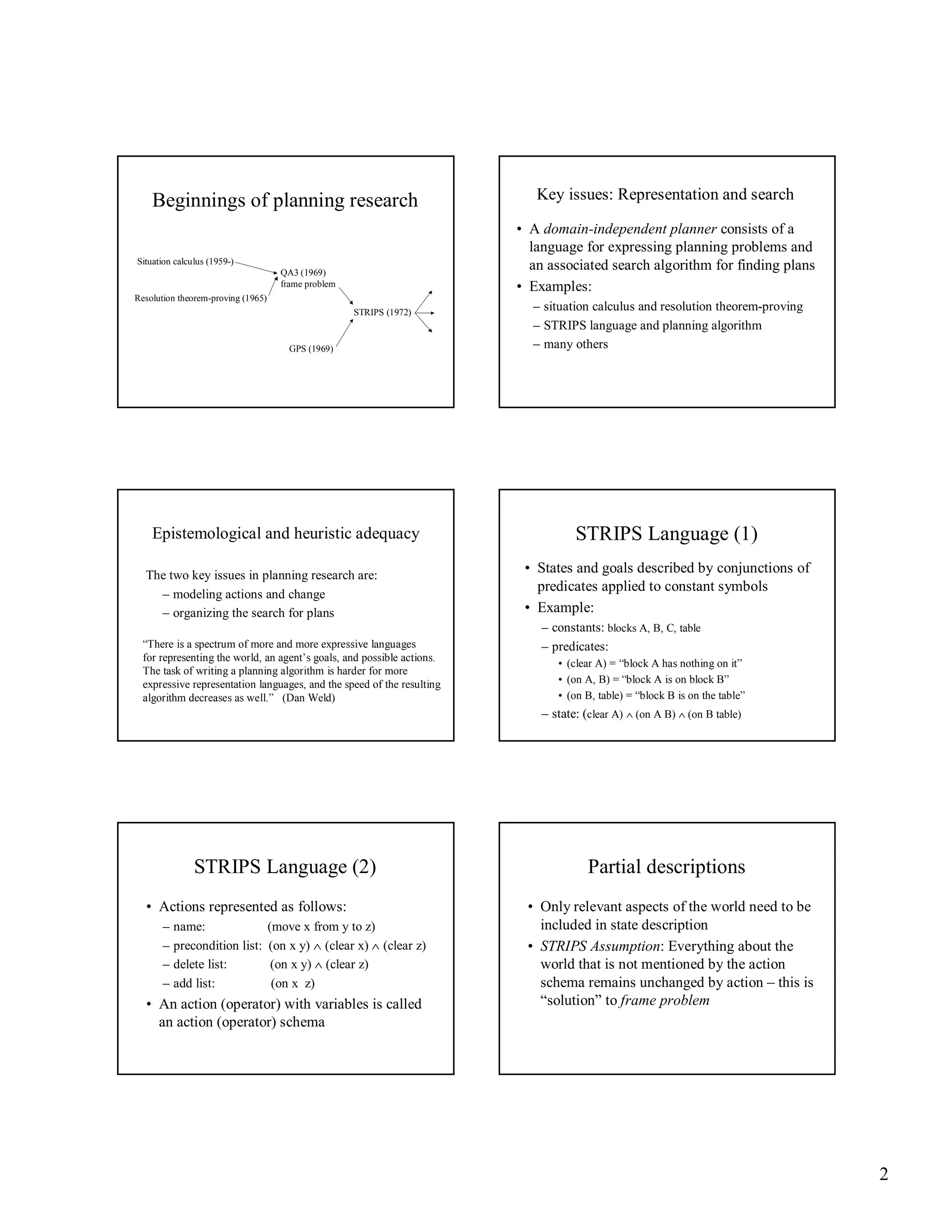 Artificial intelligence planning involves representing problems as initial states, goals, and actions that can transform states. Classical planning uses representations like STRIPS to search for sequences of actions to transform the initial state into a goal state. Recent research focuses on more expressive representations and techniques like partial-order planning to reduce the complexity of searching large problem spaces.