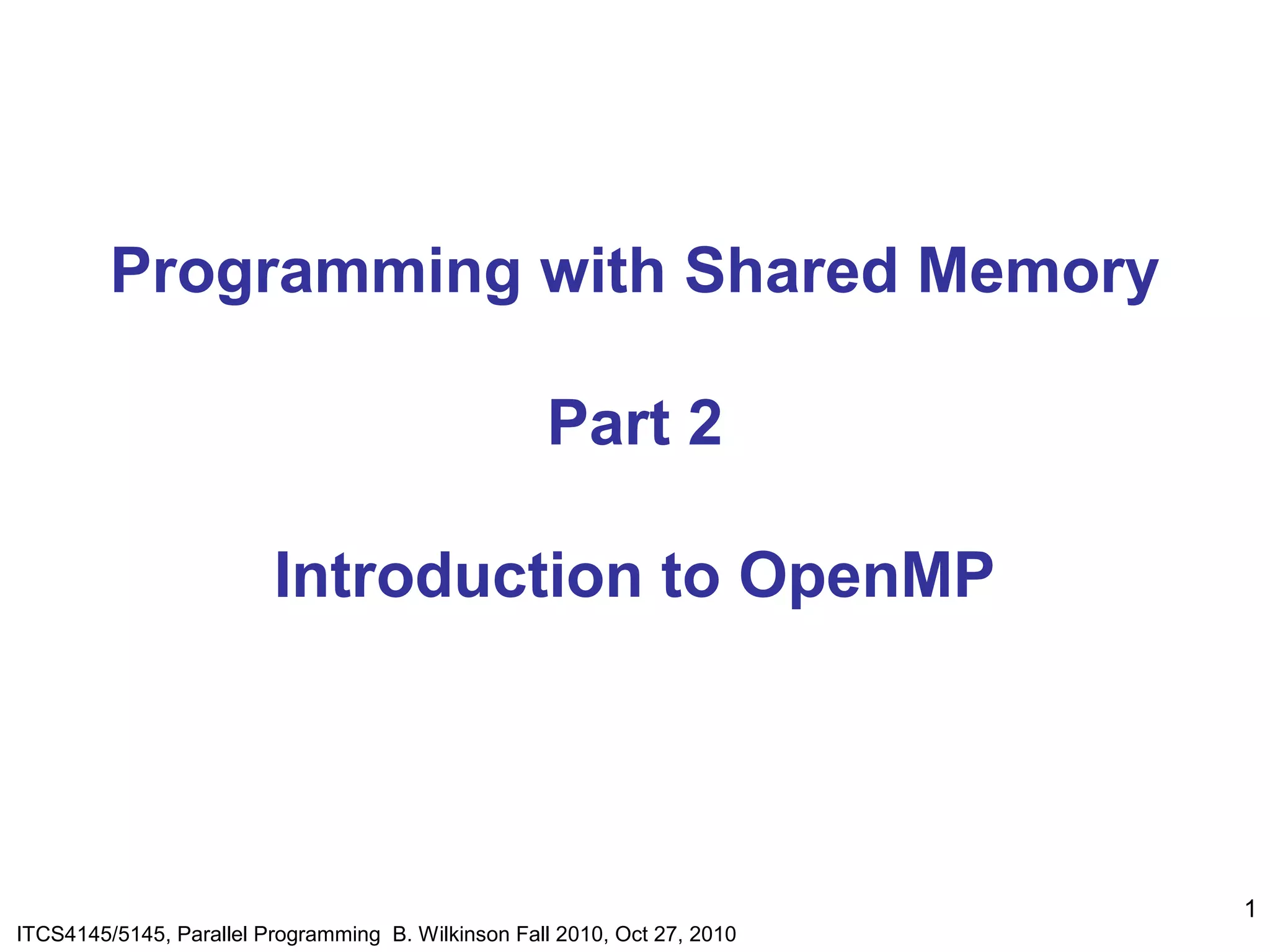 This document provides an introduction to OpenMP, a standard for parallel programming using shared memory. OpenMP uses compiler directives like #pragma omp parallel to create threads that can access shared data. It uses a fork-join model where the master thread creates worker threads to execute blocks of code in parallel. OpenMP supports work sharing constructs like parallel for loops and sections to distribute work among threads, and synchronization constructs like barriers to coordinate thread execution. Variables can be declared as private to each thread or shared among all threads.