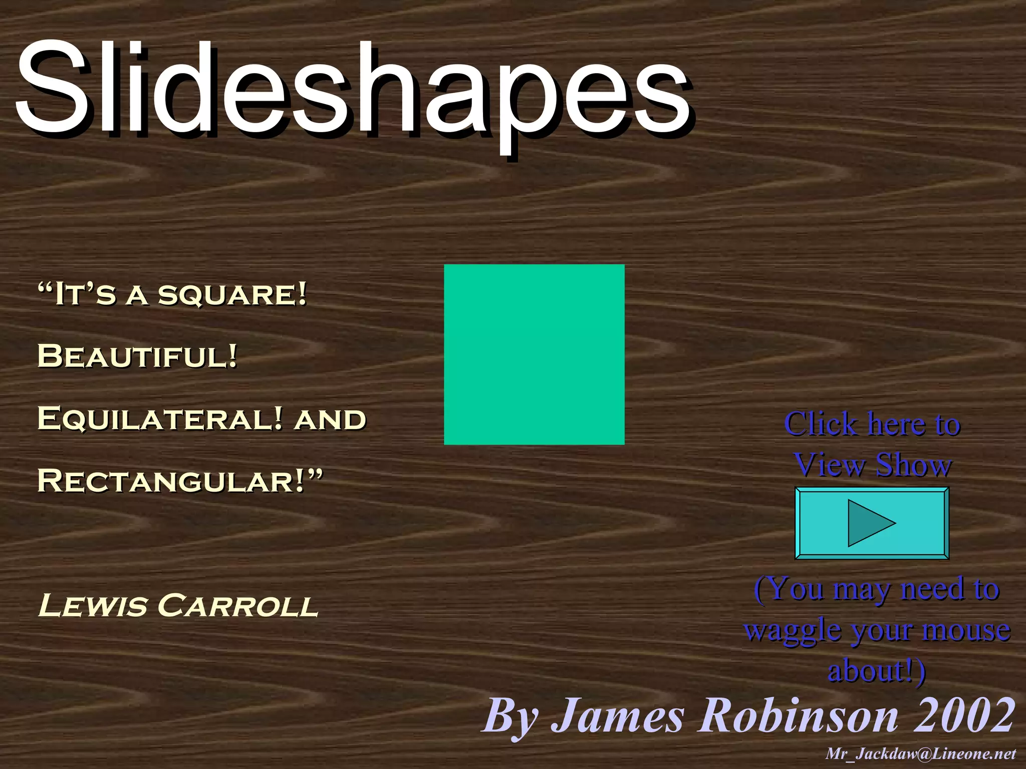 This document is a slideshow presentation by James Robinson from 2002 about shapes. It contains a quote from Lewis Carroll referring to squares, rectangles, and equilateral shapes. The document provides contact information for the creator and a link to view the slideshow, which may require moving the mouse.