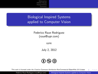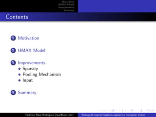 The document discusses improvements that can be made to the HMAX model of object recognition inspired by the human visual system. It proposes adding sparsity through lateral inhibition, exploring new pooling mechanisms, and using salient inputs like optical flow. The goal is to make the model more biologically plausible while reducing computational costs.