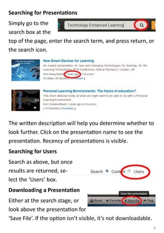 Slideshare is an online document hosting service for uploading and sharing presentations. It allows students to share presentations for educational purposes and researchers to share specialist knowledge. To use Slideshare, users create an account, search for presentations by keyword, and have the option to download, upload, or embed presentations. Uploaded presentations can be edited, including replacing documents while maintaining the URL.