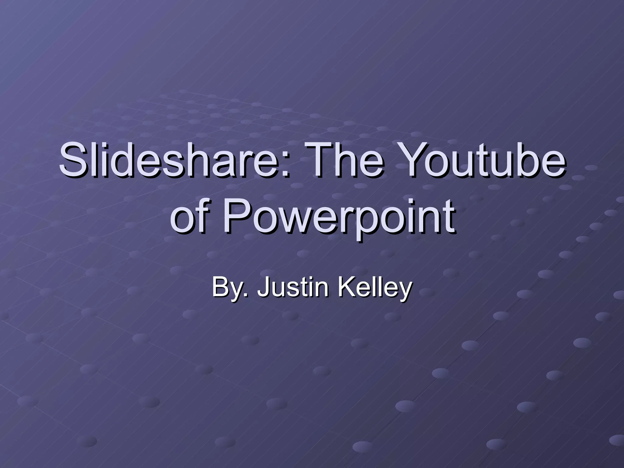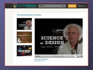 Slideshare is a platform for sharing PowerPoint presentations that allows users to search for presentations on topics, upload their own presentations, and add video or audio to PowerPoint files.