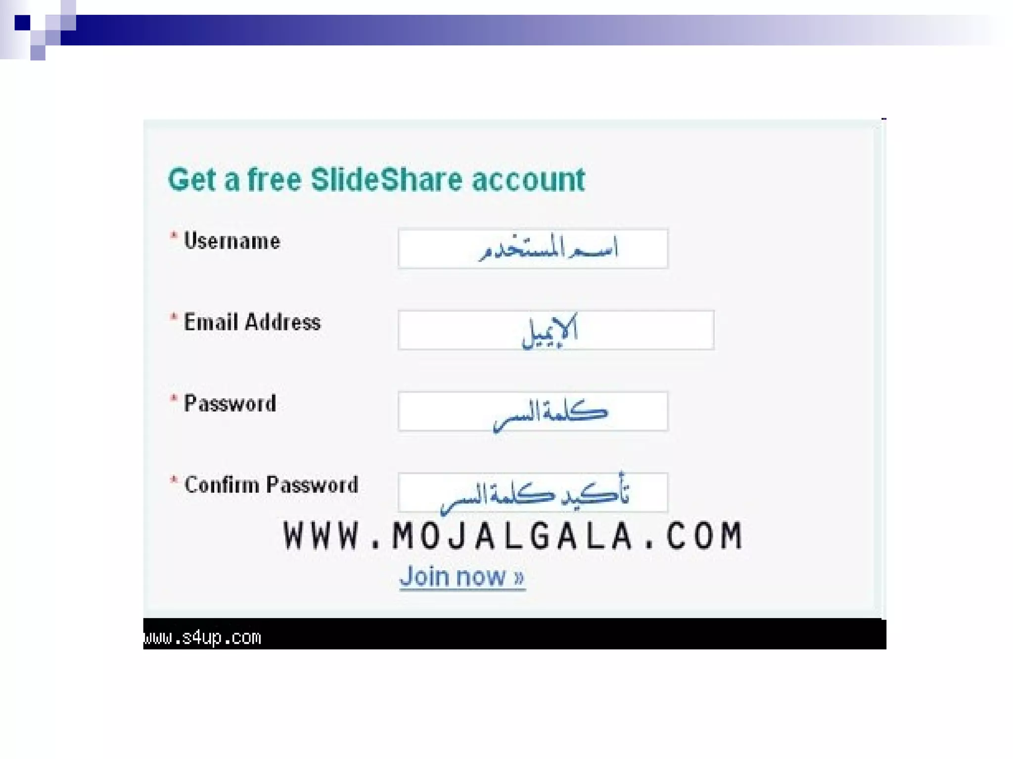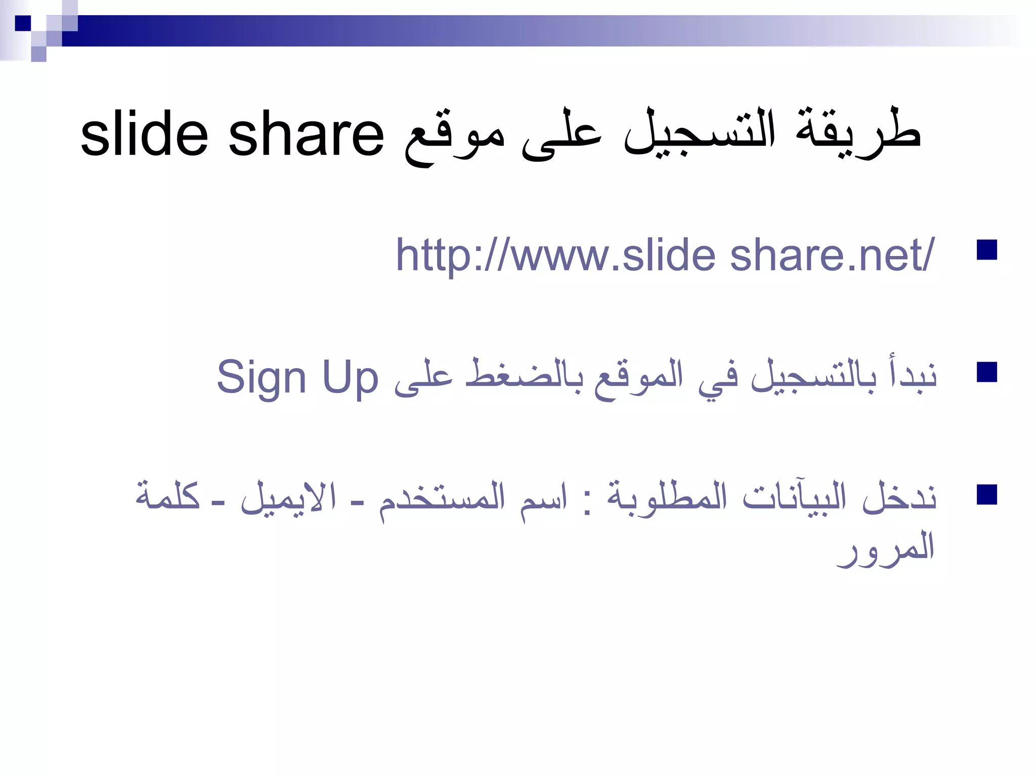 توضح الوثيقة كيفية التسجيل في موقع SlideShare، بدءًا من الضغط على 'sign up' وإدخال البيانات المطلوبة، وصولاً إلى تفعيل الحساب وإضافة ملف البوربوينت. بعد رفع العرض التقديمي، يمكن تحديد الخصوصية وسماحية المشاهدة، وأخيرًا نشر العرض ومشاركته عبر الكود. تتضمن الوثيقة أيضًا خطوات لتعديل العرض أو إضافة تعليق صوتي.