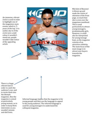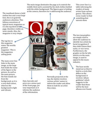 The document summarizes the design elements of a magazine cover. The masthead uses a bold outline and large font to grab attention. The main image dominates the center taking up 1/3 of the page and features an artist looking at the camera to address the audience. Additional graphics and text provide information about artists and articles to interest potential readers.