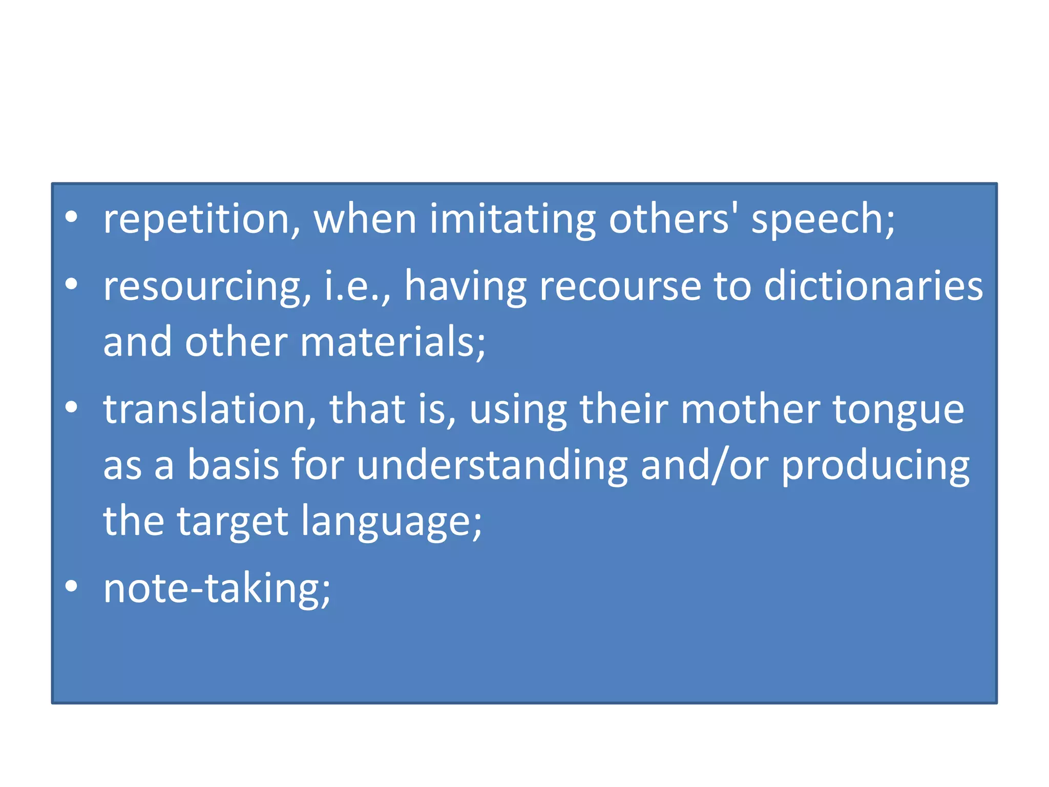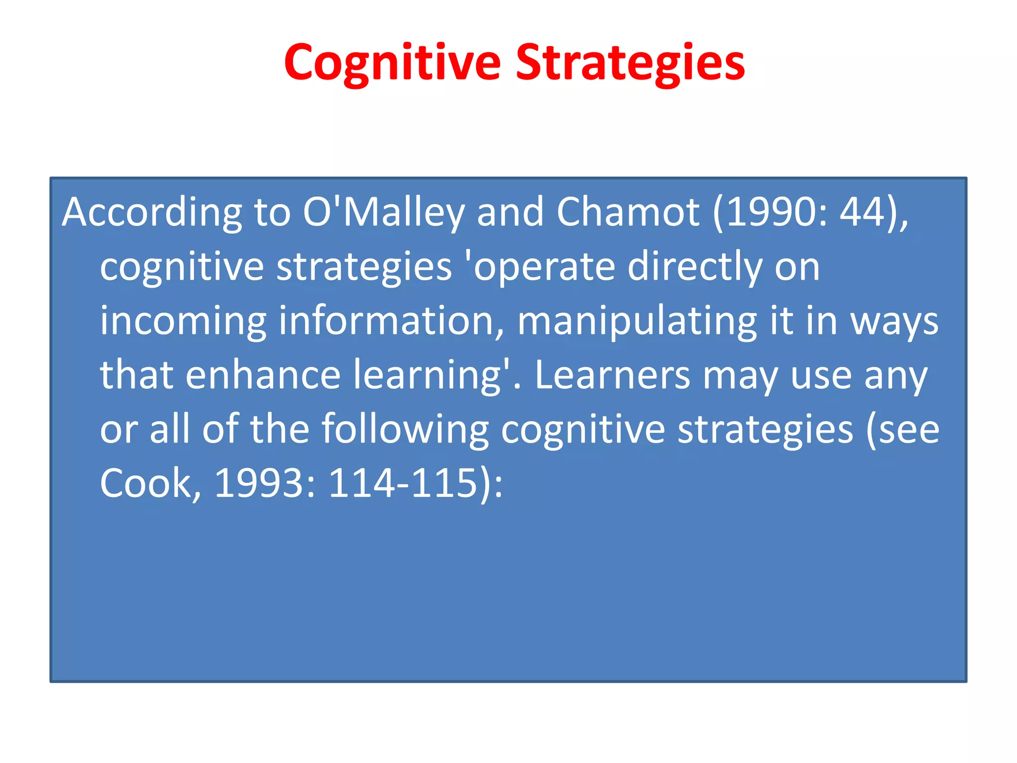 This document discusses cognitive and metacognitive learning strategies. It lists several cognitive strategies that directly manipulate incoming information to enhance learning, such as repetition, translation, note-taking, and inferencing. Metacognitive strategies are skills used for planning, monitoring, and evaluating the learning process. Examples provided include directing attention, self-monitoring, planning objectives, and evaluating outcomes based on criteria.