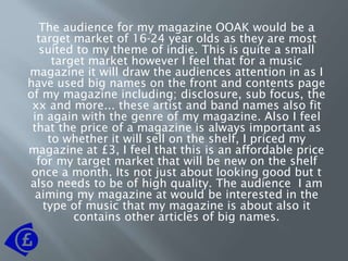The document discusses plans for a new music magazine called OOAK. It aims to target 16-24 year olds as they are most interested in indie music, the theme of the magazine. While this is a small target market, the magazine will draw attention by featuring popular indie artists like Disclosure, The XX, and Sub Focus on the front cover and in articles. The author believes pricing the magazine at £3 makes it affordable for the target audience and will sell well on shelves as a monthly publication.