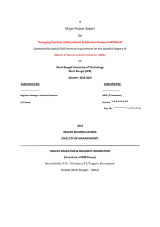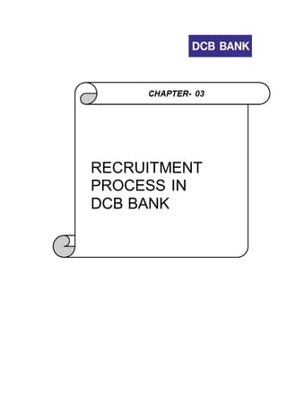 This document appears to be a student project report on the recruitment and selection processes at DCB Bank. It includes an introduction to DCB Bank, its history and organizational structure. It then discusses the types of products DCB Bank deals with, both secured and unsecured. The document defines recruitment and selection, and discusses the need for recruitment. It provides context on the recruitment and selection practices at DCB Bank as the focus of the student report.
