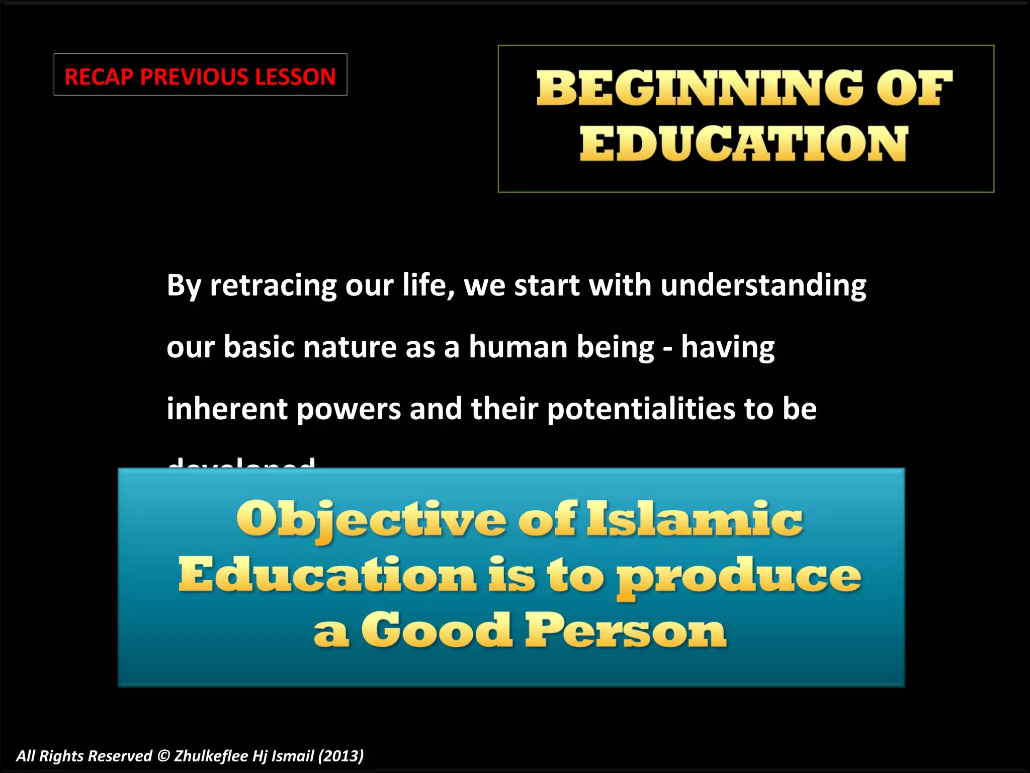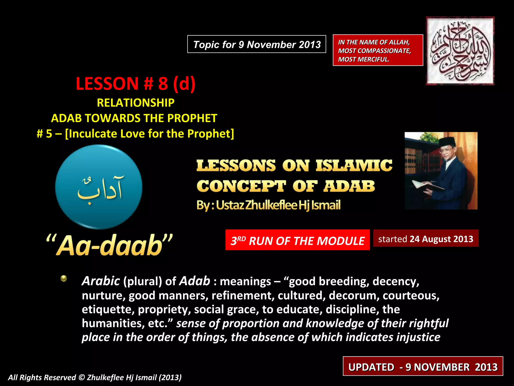 The document discusses inculcating love for the Prophet Muhammad. It notes that true love for Allah can only be achieved through obeying the Prophet, who is most beloved to Allah. It emphasizes developing adab, or good character, towards the Prophet by prioritizing following him over all other relations and attachments. The document also highlights showing respect to the Prophet's household and companions. It provides several hadith about the elevated status of the Prophet and how Muslims should hold him in the highest esteem.