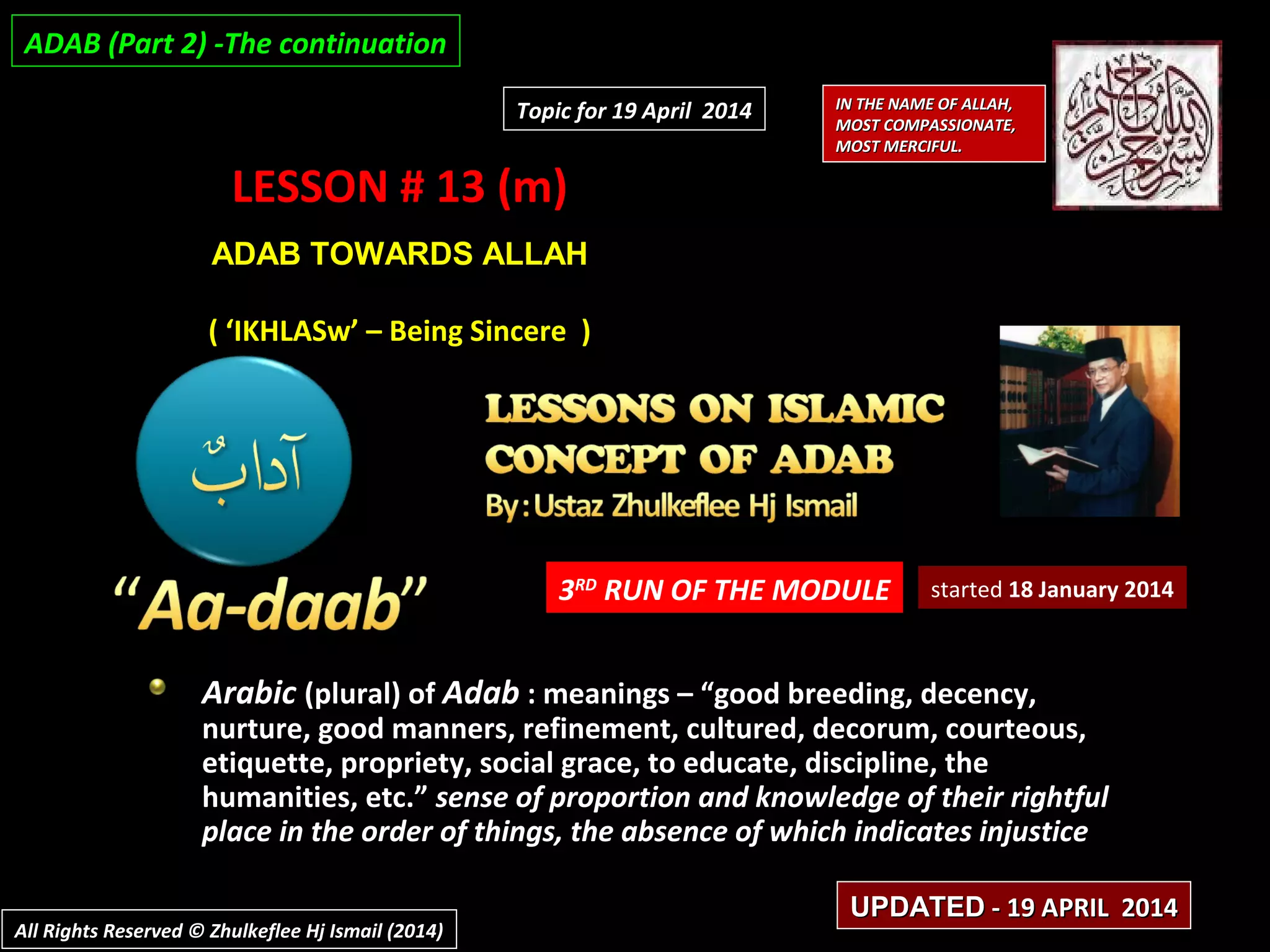 This document discusses the concept of 'adab' or manners towards Allah. It begins by defining the Arabic plural of 'adab' which refers to good breeding, decency, nurturing good manners and propriety. The document is a lesson that discusses topics like the human self and its inherent powers, faith, manners and etiquette in worshipping Allah with sincerity and avoiding hypocrisy or taking others as allies instead of believers. Verses from the Quran are cited emphasizing the importance of sincere faith in Allah alone and avoiding arrogance and ingratitude.