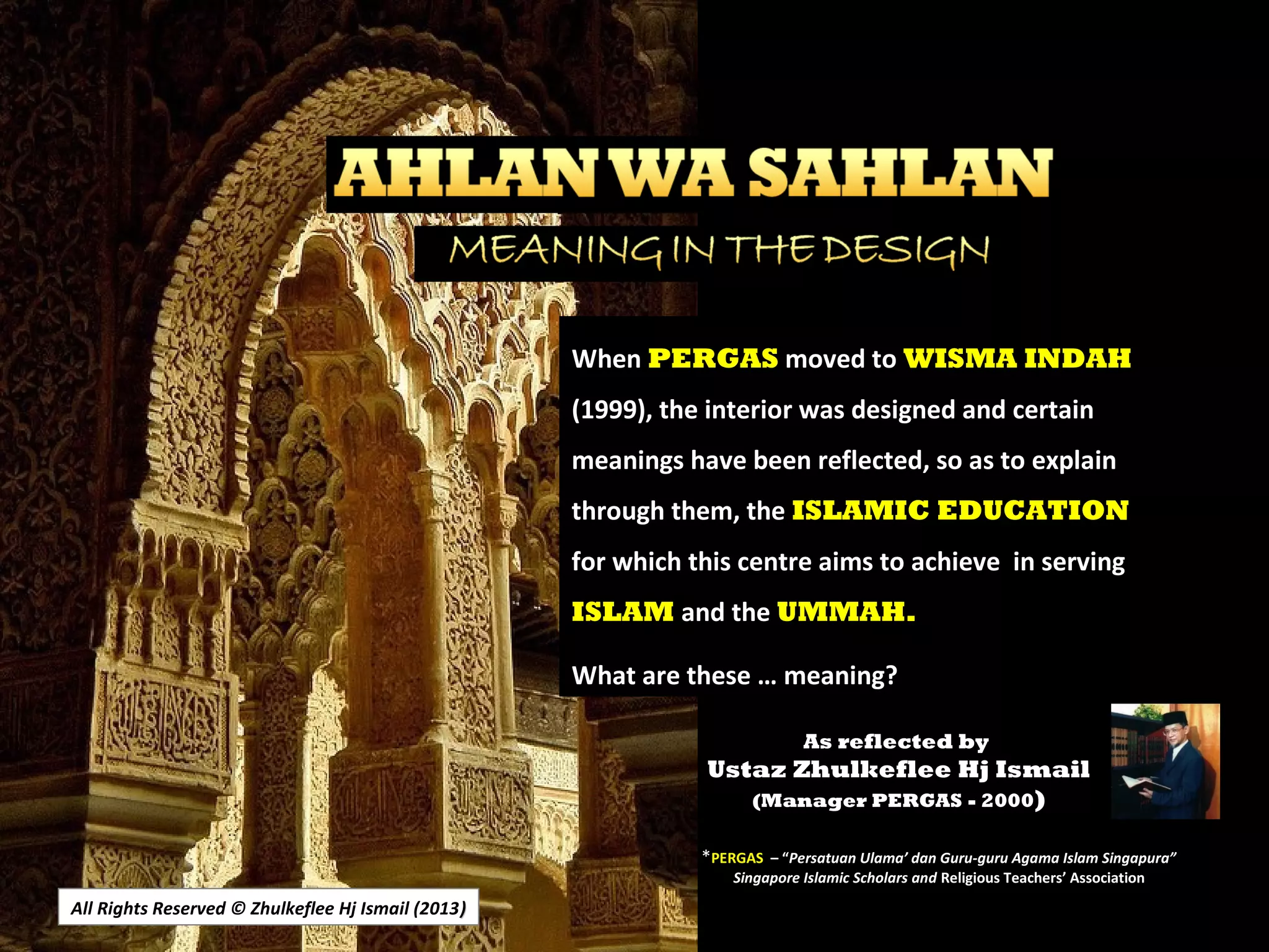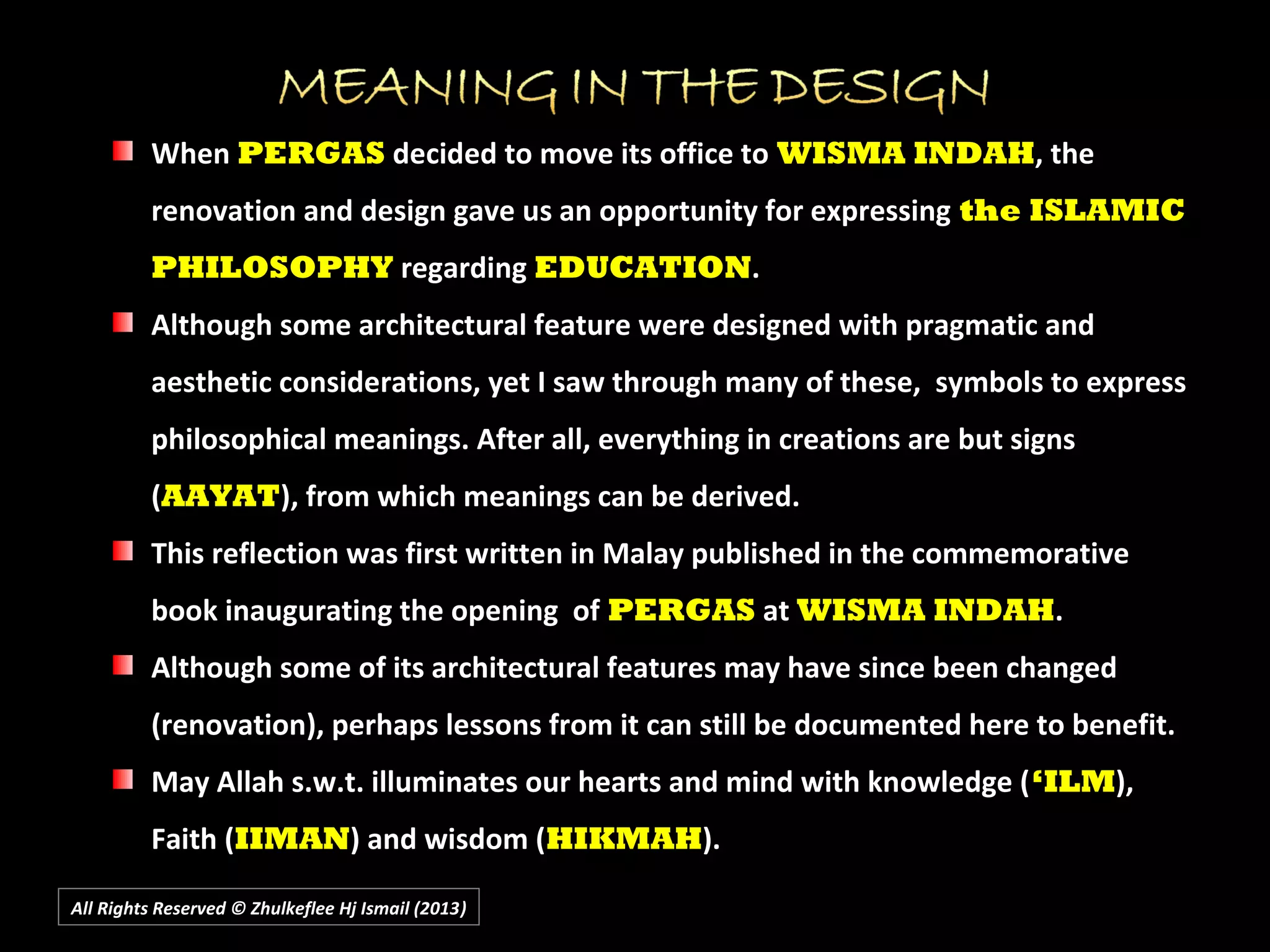The document describes the symbolic meanings behind the interior design of PERGAS office space in WISMA INDAH. When PERGAS relocated, the design of the interior was meant to reflect Islamic education philosophy. The crazy tile flooring in the lift lobby represents the complex modern world, while the sandy floor across represents a tranquil transformed space, separated by a river. Traversing through archways symbolizes spiritual states a knowledge seeker must progress through. A fountain representing divine revelation is the source of this transformative knowledge. The design aims to guide visitors on a journey that reflects Islamic concepts of seeking knowledge.