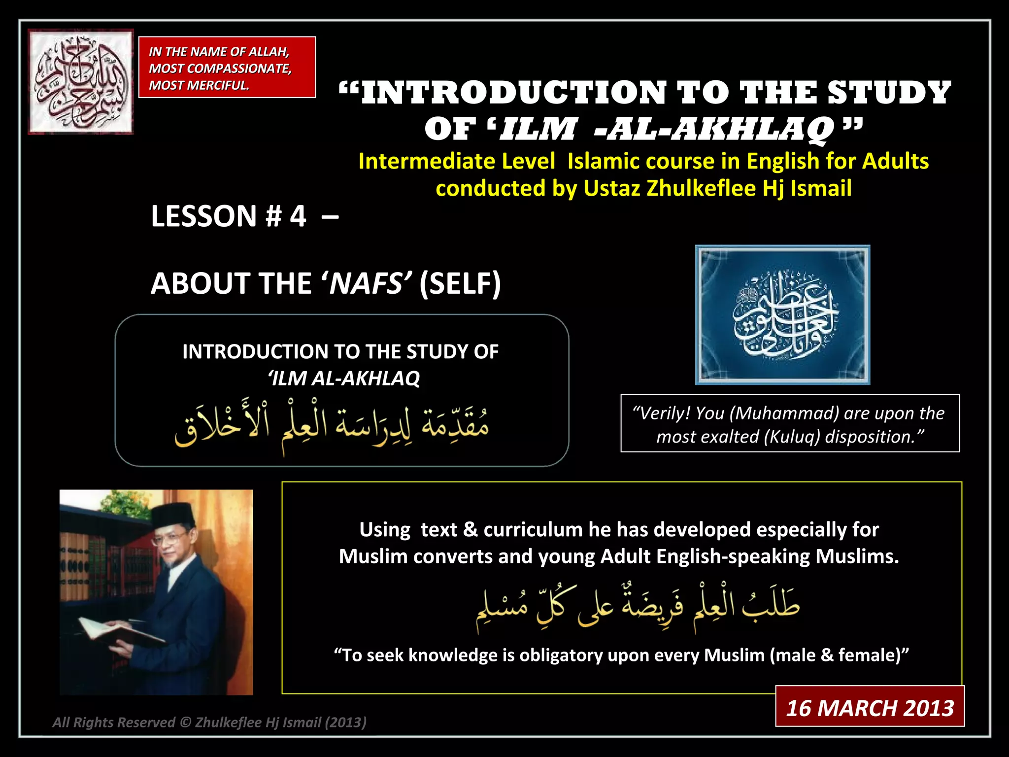 The document is a lesson on studying 'ilm al-akhlaq (the science of ethics) and the human nafs (self). It discusses the nafs, how it is formed according to its purpose, and how maintaining its purity is important for spiritual growth. It also examines the faculties and powers within humans, comparing them to other beings, and how properly nurturing these can help or hinder development. The goal is to understand the nature and state of the nafs in order to cultivate good character and virtues.