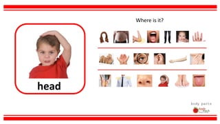 This document provides a list of basic body parts and their locations, along with suggested activities for teaching body parts such as naming, matching, following directions, describing functions, and incorporating sound effects. It is presented by ApplePatchTherapy.com as part of their materials on shining light on speech and language.