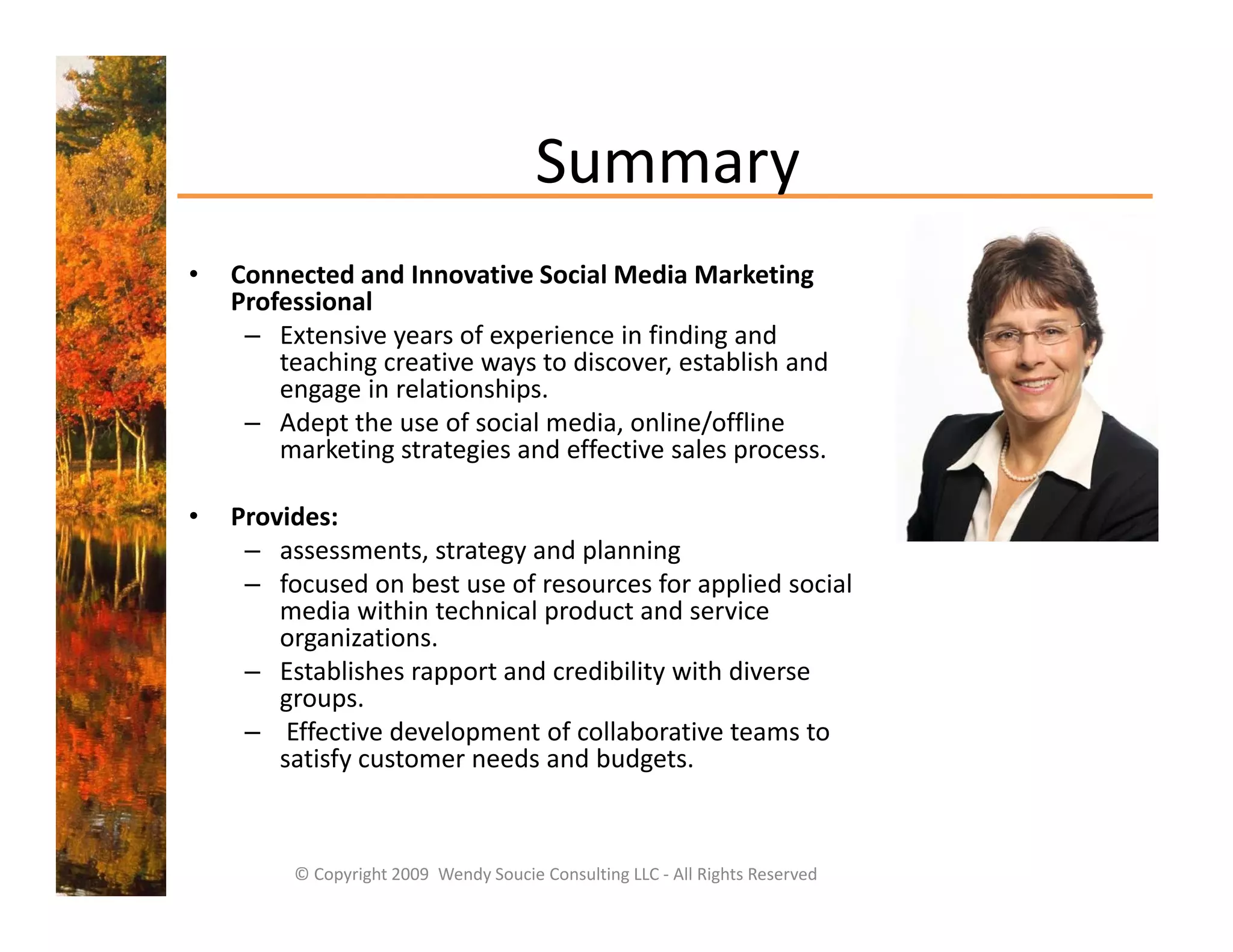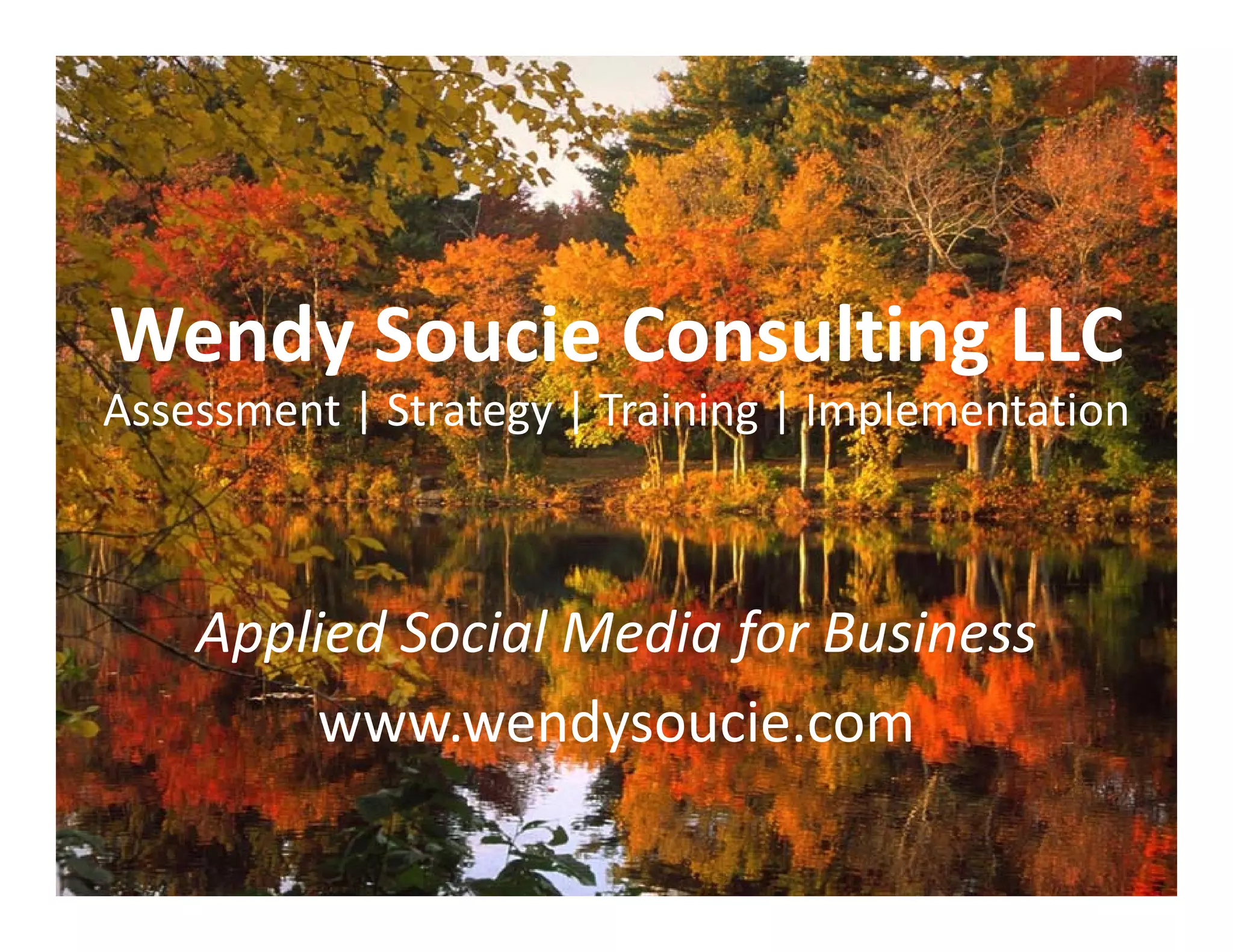 Wendy Soucie Consulting LLC provides social media assessment, strategy, training, and implementation services for businesses. The company helps clients maximize their use of social media for marketing and business development. Services include assessing a client's social media presence and needs, developing strategic social media plans, training staff, and managing client social media profiles and content. Typical clients include technical businesses, professional services firms, and individuals seeking to build their personal brand online through social media.