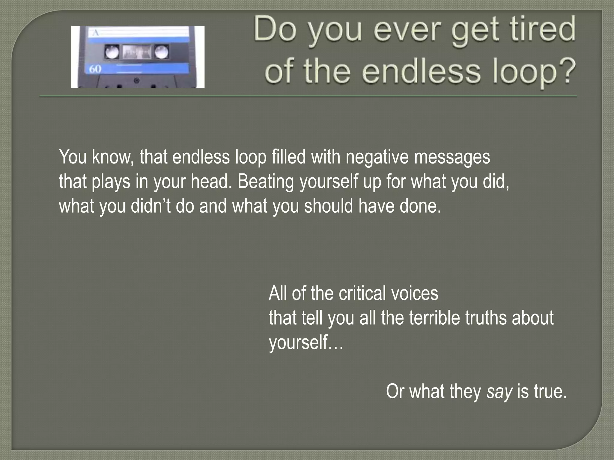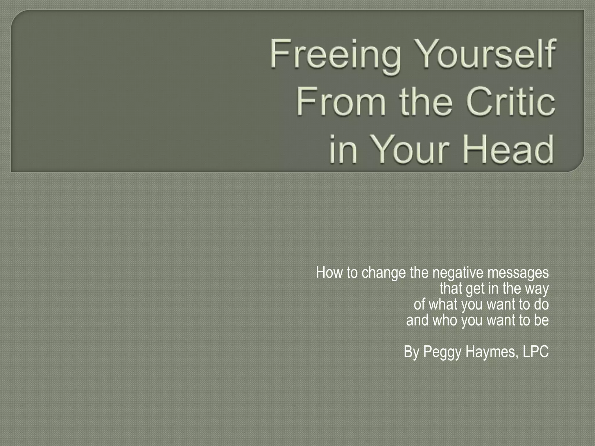 The document discusses how to overcome negative self-talk and internalized critical voices that hinder personal growth and goal achievement. It offers strategies for disarming these negative messages, such as evicting the critic from your mind, reframing absolute statements, and focusing on empowering thoughts. It emphasizes the importance of seeking support and considering professional therapy if needed, while also promoting resources for further self-improvement.