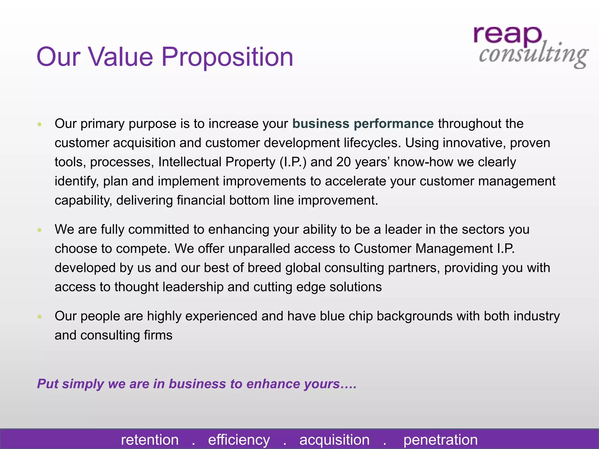 The document discusses a value proposition for successful customer relationship management (CRM). It summarizes that the company's primary purpose is to increase business performance across the customer lifecycle using proven tools and processes. The company offers access to CRM intellectual property and experienced consultants. It asserts that the typical CRM approach focuses too much on capabilities and not enough on financial impact, while the company's approach emphasizes sources of value and realizing financial returns through CRM.