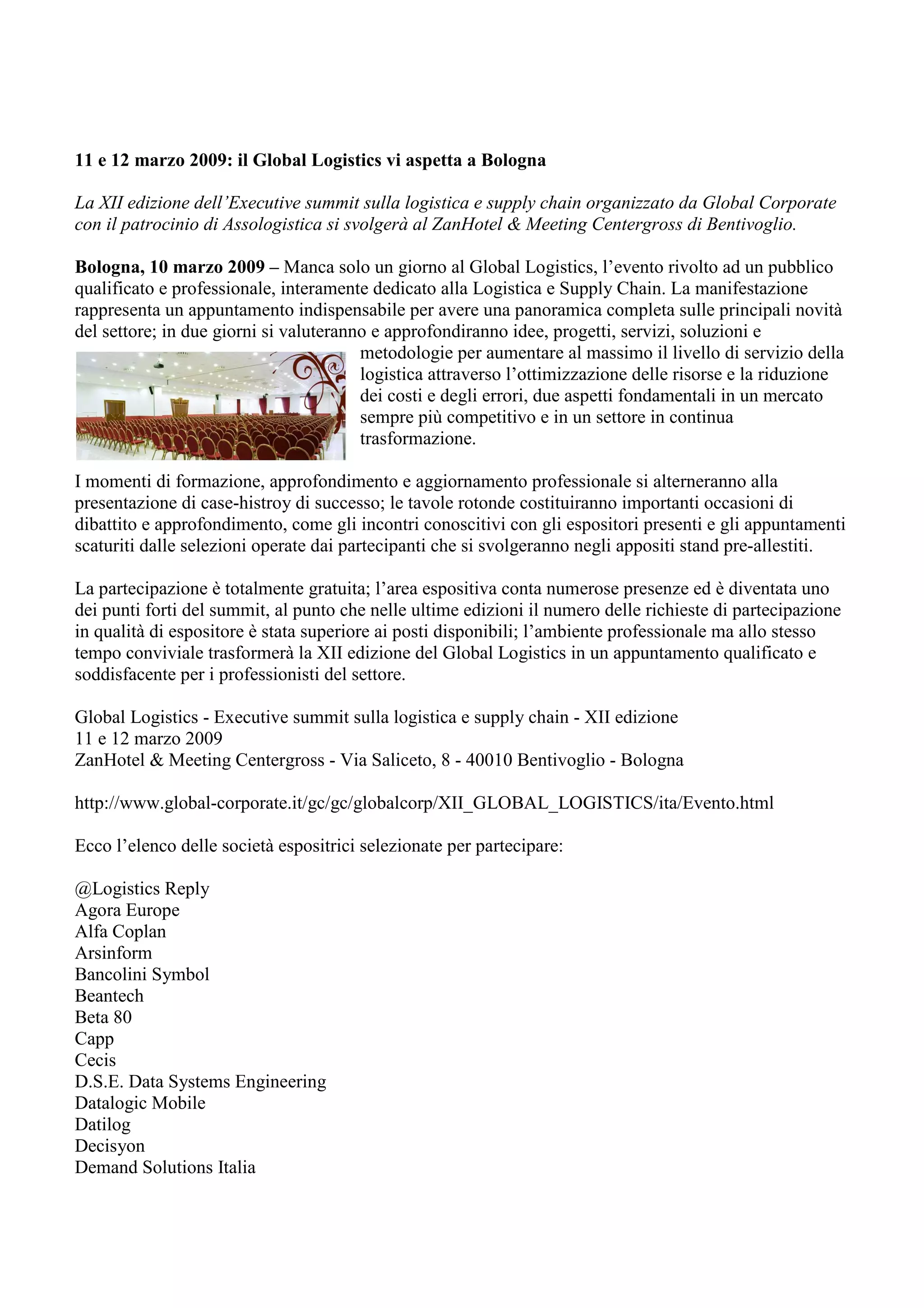 L'11 e 12 marzo 2009 si svolgerà a Bologna la XII edizione del Global Logistics, un summit dedicato alla logistica e supply chain, con l'obiettivo di presentare novità del settore e ottimizzare le risorse. La manifestazione offrirà momenti di formazione, dibattiti e opportunità di networking gratuitamente per i professionisti del settore. Saranno presenti numerose aziende espositrici, rendendo l'evento un'importante occasione di aggiornamento e scambio tra operatori del settore.