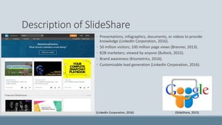SlideShare is a platform that allows users to share presentations, documents, videos and other materials. It has over 50 million visitors and 100 million page views monthly. Business users typically use SlideShare to share product information, keep up with industry trends and build their professional online presence. End users are often social media enthusiasts who use SlideShare to communicate with consumers and strengthen their brand presence. SlideShare can be used for lead generation by including forms in presentations. Successful companies on SlideShare post relevant content from reliable sources and include calls to action.