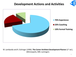 The document discusses the importance of executive coaching for developing competencies critical for senior-level business leaders. It notes that 70% of executive development comes from on-the-job experience, while 20% comes from coaching and 10% from formal training. Replacing an executive can cost an estimated $800,000 due to separation, vacancy, replacement, socializing, and ramp-up costs. Executive coaching helps maximize performance, enhance retention, and strengthen competencies like strategic orientation, customer impact, and change leadership. Coaching addresses blind spots, builds on strengths, and improves leadership approaches through activities like diagnostic assessments, development planning, and meetings.