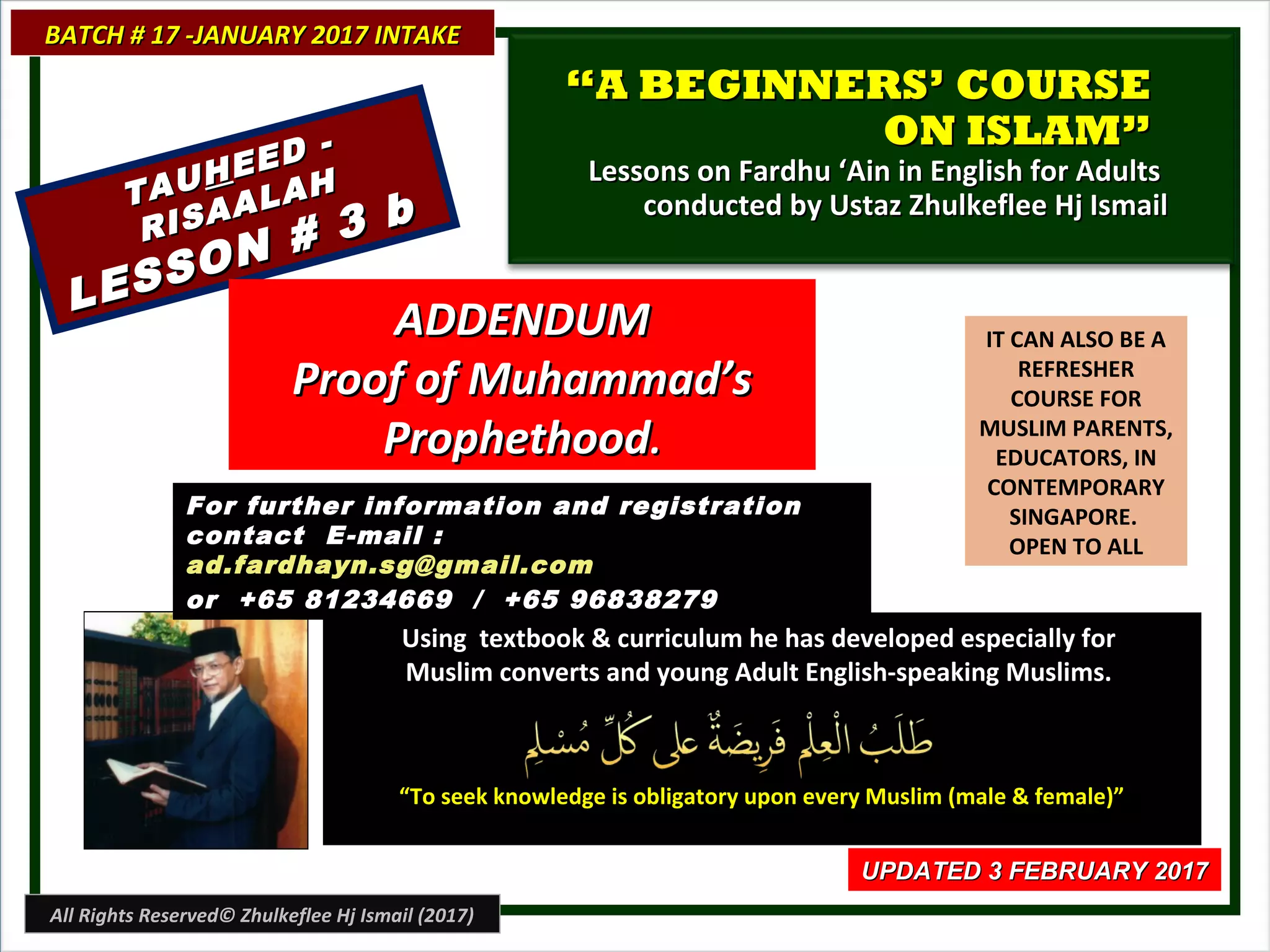This document provides information about an Islamic course on the basic teachings of Islam called "Fardhu'ain" conducted in Singapore by Ustaz Zhulkeflee Hj Ismail. It discusses lessons from a textbook on Islam and includes verses from the Quran, explanations of Islamic concepts, and comparisons between the prophets Muhammad and Moses. The document aims to educate Muslims and newcomers to Islam on its fundamental beliefs and principles.