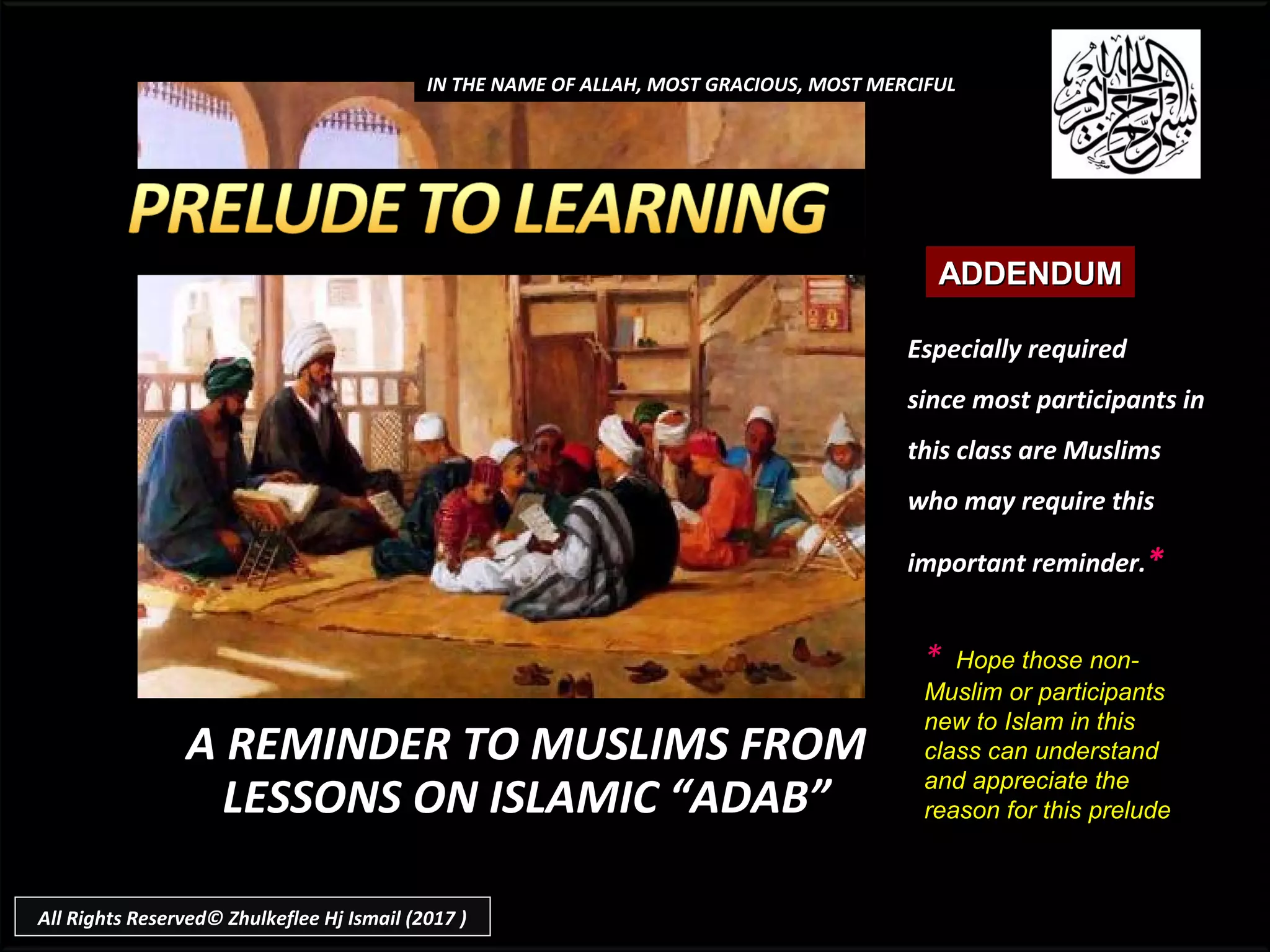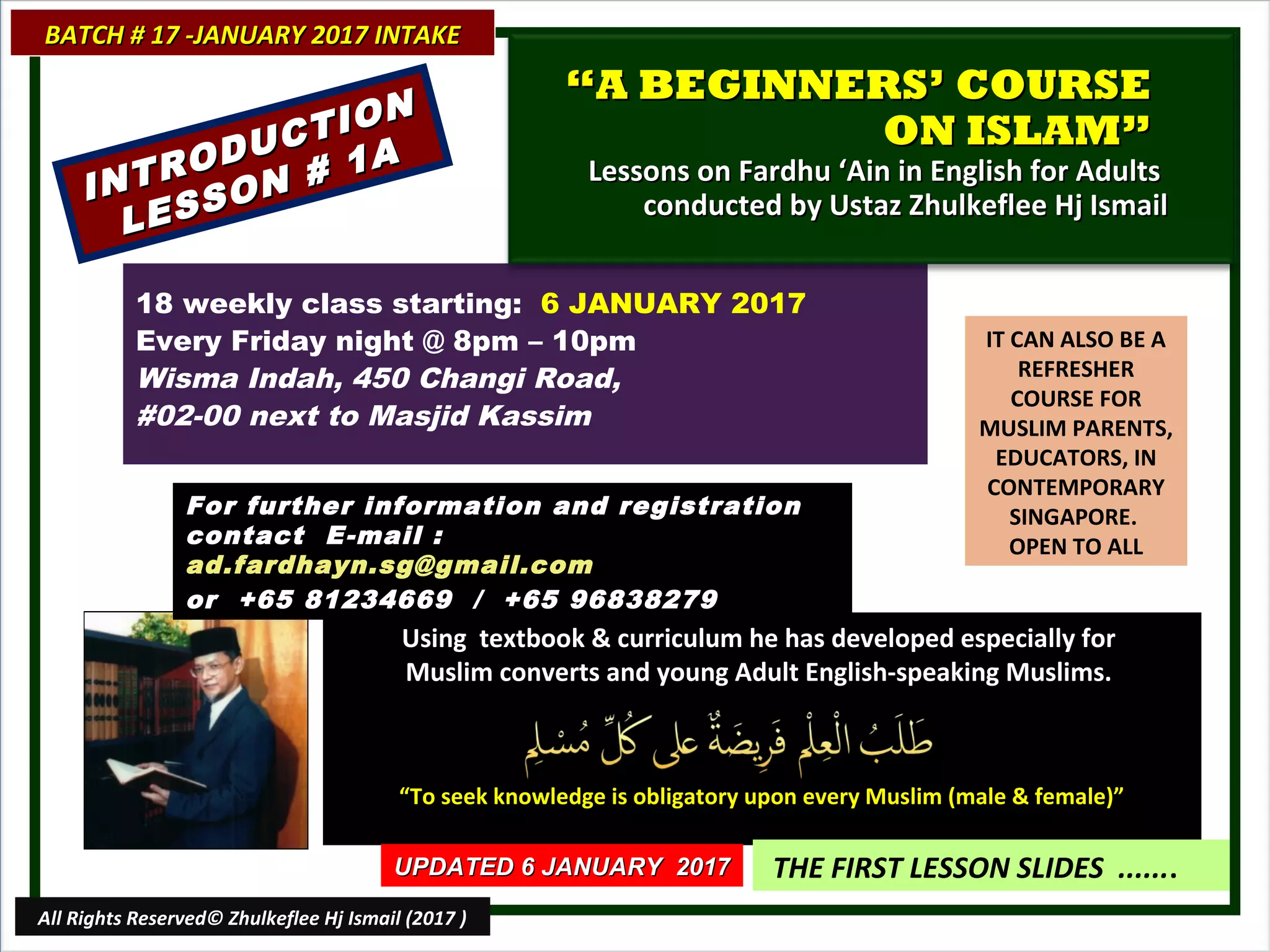 This document appears to be advertising an introductory course on Islam taught in English for Muslim adults and converts in Singapore. It provides information about the course, including that it will be held weekly on Fridays from 8-10pm starting January 6, 2017 at a location near a mosque. Contact information is provided for registration. The document also includes introductory slides that discuss establishing good character by purifying one's soul and acquiring knowledge and manners in a balanced way.