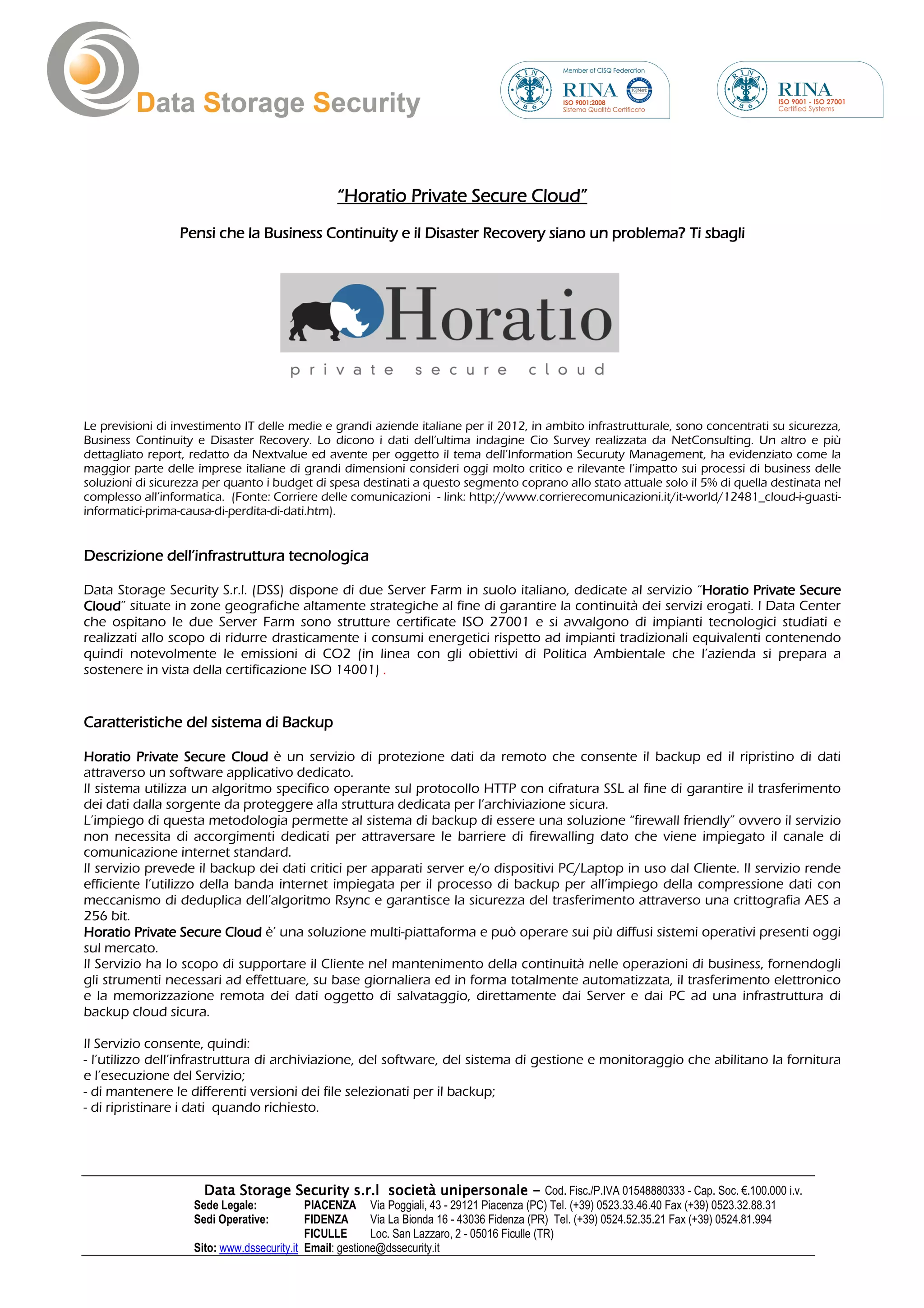 Il documento discute l'importanza della business continuity e del disaster recovery per le aziende italiane, evidenziando come il budget per la sicurezza informatica rappresenti solo il 5% della spesa informatica totale. Descrive la soluzione 'Horatio Private Secure Cloud' di Data Storage Security, un servizio di backup dati che utilizza tecnologia avanzata per garantire la sicurezza e l'efficienza del trasferimento dei dati. Questo servizio supporta le aziende nel mantenimento della continuità operativa, rendendo il processo di backup automatizzato e sicuro.