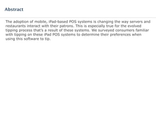 The adoption of iPad POS systems is changing how restaurants interact with customers. A survey found that 86% of respondents prefer to input their own tip rather than have the server do it. Close proximity of servers encouraged 41% of respondents to tip more. Nearly 90% found iPad POS systems not difficult to tip on. Almost 30% would be more likely to tip if they had to select a "no tip" button. While most prefer inputting their own tip, 35% of women would tip more if the server input it. A majority prefer using iPad POS at casual or fast casual restaurants like Panera.