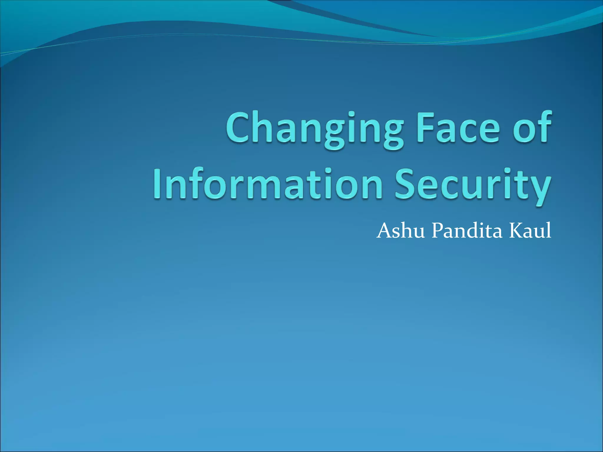 - It outlines common threats to information security like hackers, espionage, social engineering, and unauthorized access.