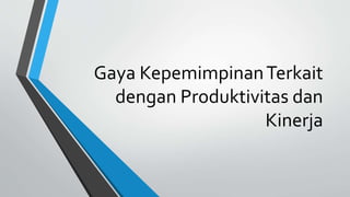 Dokumen tersebut membahas tentang pengaruh gaya kepemimpinan terhadap produktivitas kerja. Gaya kepemimpinan yang efektif dapat mempengaruhi bawahan untuk meningkatkan motivasi dan prestasi kerja guna mencapai tujuan bersama perusahaan. Faktor-faktor seperti sikap mental, pendidikan, keterampilan, manajemen, penghasilan, sarana produksi, dan teknologi dapat mempengaruhi produktivitas tenaga ker
