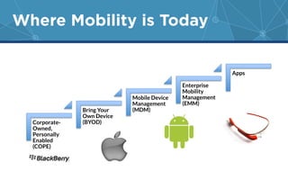The document discusses the evolution of mobile applications in manufacturing, emphasizing the transition from mobile device management (MDM) to enterprise mobility management (EMM) and the importance of managing apps for operational excellence. It highlights opportunities for process improvements, such as optimizing workflows and enhancing decision-making through better data access. Success stories illustrate how companies like PCM and Luverne Truck effectively utilized mobile apps to increase efficiency and reduce operational costs.