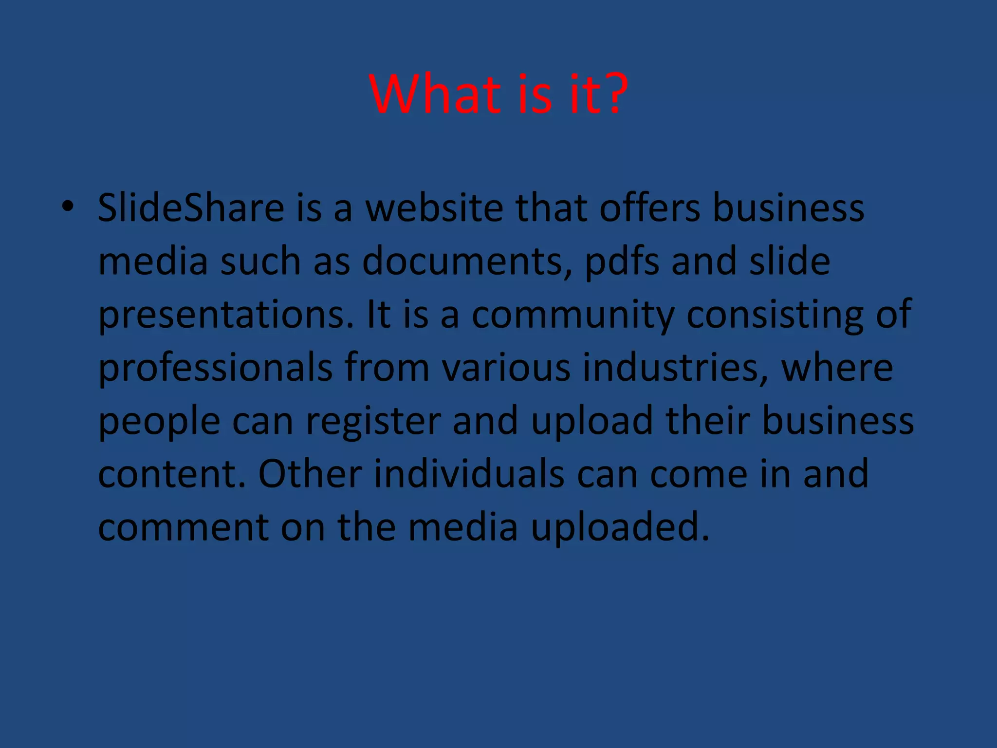 SlideShare is a website that allows users to upload and share business presentations, documents, videos, and other media. Users can upload content, comment on other uploads, and access materials from a broad range of industries. However, animations and effects from uploads like PowerPoint are lost, and music files cannot be embedded. Overall, SlideShare provides a way to publicly share professional content online.