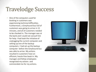 1) The author resolved a computer issue at their hotel, checking in customers on time.