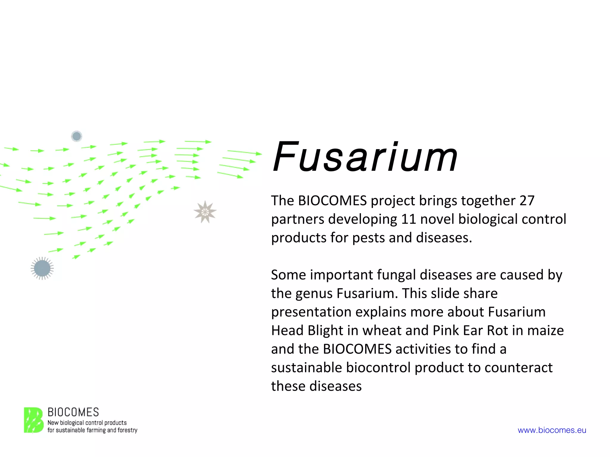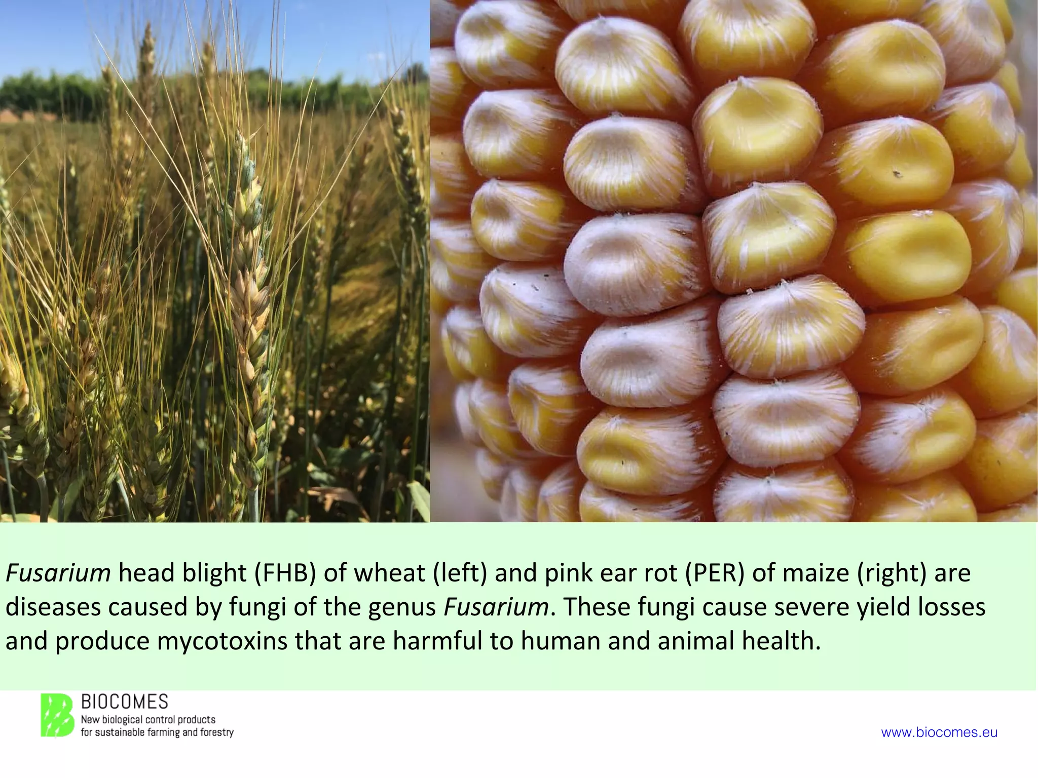 The BIOCOMES project involves 27 partners developing 11 biological control products, including a seed treatment using the fungus Trichoderma harzianum to control Fusarium head blight in wheat and pink ear rot in maize. Laboratory and greenhouse studies showed Trichoderma has the potential to control these above-ground diseases when applied below-ground as a seed treatment. Field trials were conducted in multiple countries in 2016 and 2017 to validate Trichoderma's ability to reduce Fusarium disease symptoms and mycotoxin levels in wheat and maize crops under natural conditions.