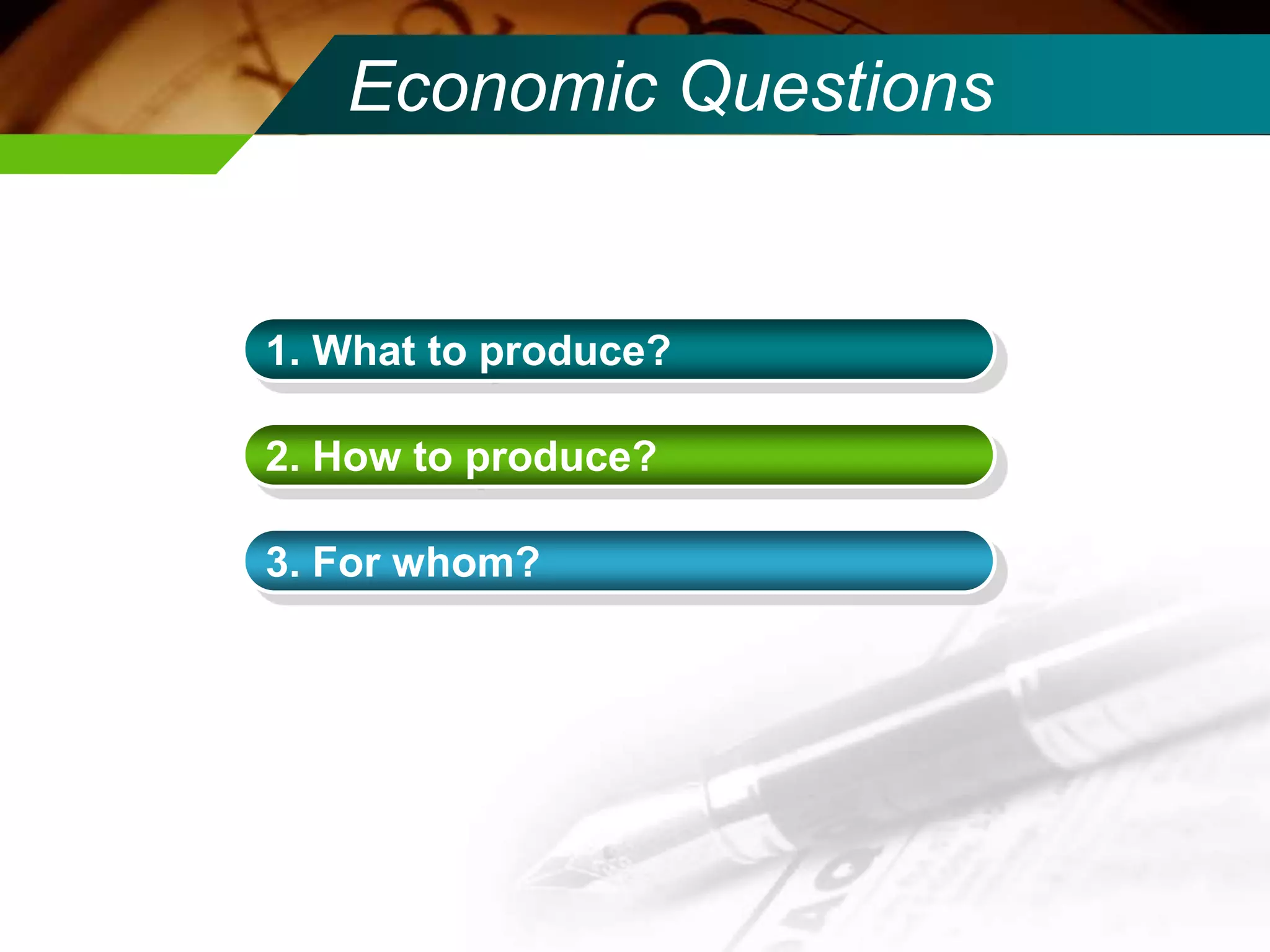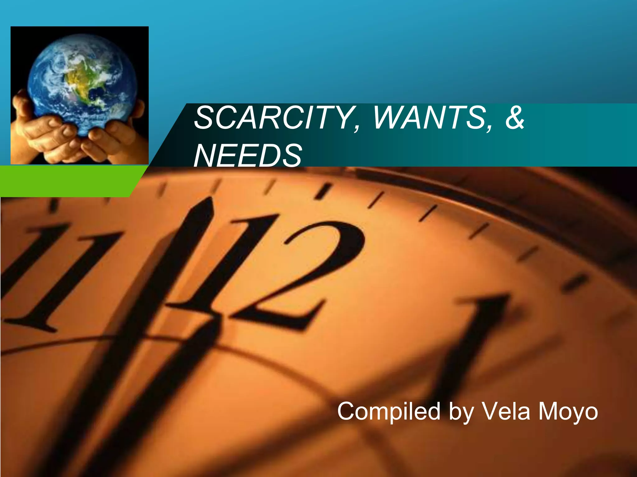 This document discusses the concepts of scarcity, wants, and needs in economics. It begins by outlining three basic economic questions about what to produce, how to produce it, and for whom. It then defines key concepts like scarcity, choice, and opportunity cost. The document notes that resources are limited while wants and needs are unlimited, forcing societies to make choices. It explains that scarcity means not all goods and services can be produced, and that choices must be made between alternatives. The circular flow of the economy and production possibility frontier are also introduced. The document emphasizes that scarcity is a permanent reality and differs from shortages, which are temporary. It concludes by distinguishing between wants and needs from an economist's perspective.