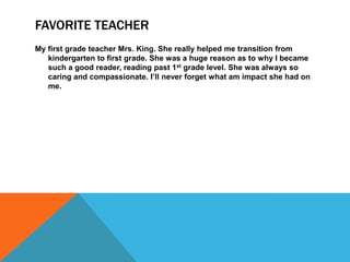The document discusses the author's favorite first grade teacher, Mrs. King, who helped her transition to first grade and become a good reader beyond the first grade level through her caring and compassionate teaching. The author wants to become a teacher to impart lifelong skills to young children, impact their lives positively as her teachers did for her by giving her confidence and belief in her abilities. She hopes to teach preschool through third grade as those early years are formative for learning life skills where a teacher's impact can be huge.