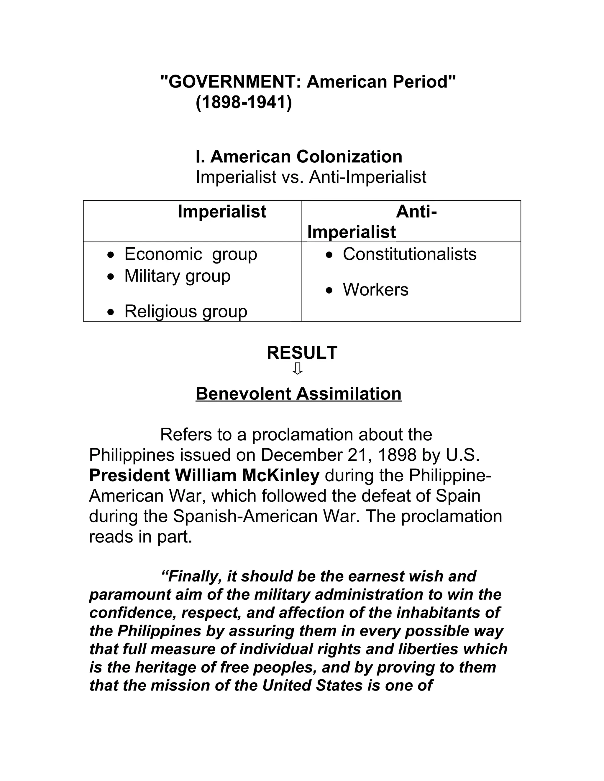 This document summarizes the American period (1898-1941) of Philippine history. [1] It describes the American colonization and the debate between imperialists and anti-imperialists. [2] It then discusses the Philippine-American War that resulted from the Filipinos rejecting the Benevolent Assimilation proclamation. [3] Finally, it outlines the policies and governance structures established during the American colonial period, including military rule, the introduction of civil rule, and the establishment of political institutions like the Philippine Assembly.