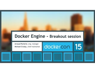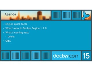 The document summarizes a Docker Engine breakout session that covered: - An overview of Docker Engine, including key facts about its contributors and development. - New features in Docker Engine 1.7.0, including an experimental binary, a new networking model, and improved network performance. - Upcoming priorities like better tooling, security enhancements, and improved management of networks and volumes. A demo was also planned to showcase Docker Engine capabilities.