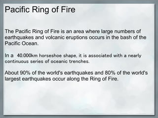 The Pacific Ring of Fire is an area in the basin of the Pacific Ocean where many earthquakes and volcanic eruptions occur. It forms a horseshoe shape around the Pacific Ocean basin, and is associated with oceanic trenches. Around 90% of the world's earthquakes and 80% of the largest earthquakes happen along the Ring of Fire. Countries like Chile, Mexico, Japan, the Philippines, and the United States have experienced major volcanic eruptions and earthquakes due to tectonic plate subduction processes along the Ring of Fire.