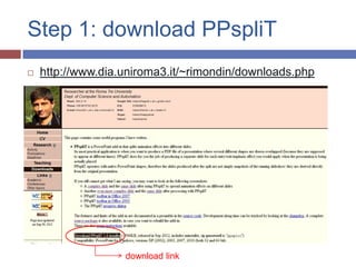 The document provides a step-by-step guide on using the software ppsplit to create SlideShare presentations with animations. It includes instructions for downloading, installing, and utilizing ppsplit to effectively split PowerPoint animations into separate slides. The process enhances the visual appeal of presentations by increasing the number of slides for animated content.