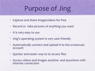 Jing is a free tool that allows users to easily capture and share images and videos. It has a user-friendly interface and automatically uploads captures to a screencast account. In the classroom, teachers can use Jing to create instructional videos, record audio to accompany images, and make videos of student work and presentations. Students benefit by getting quick feedback from teachers, creating their own videos and images to teach others, and sharing their work with classmates.
