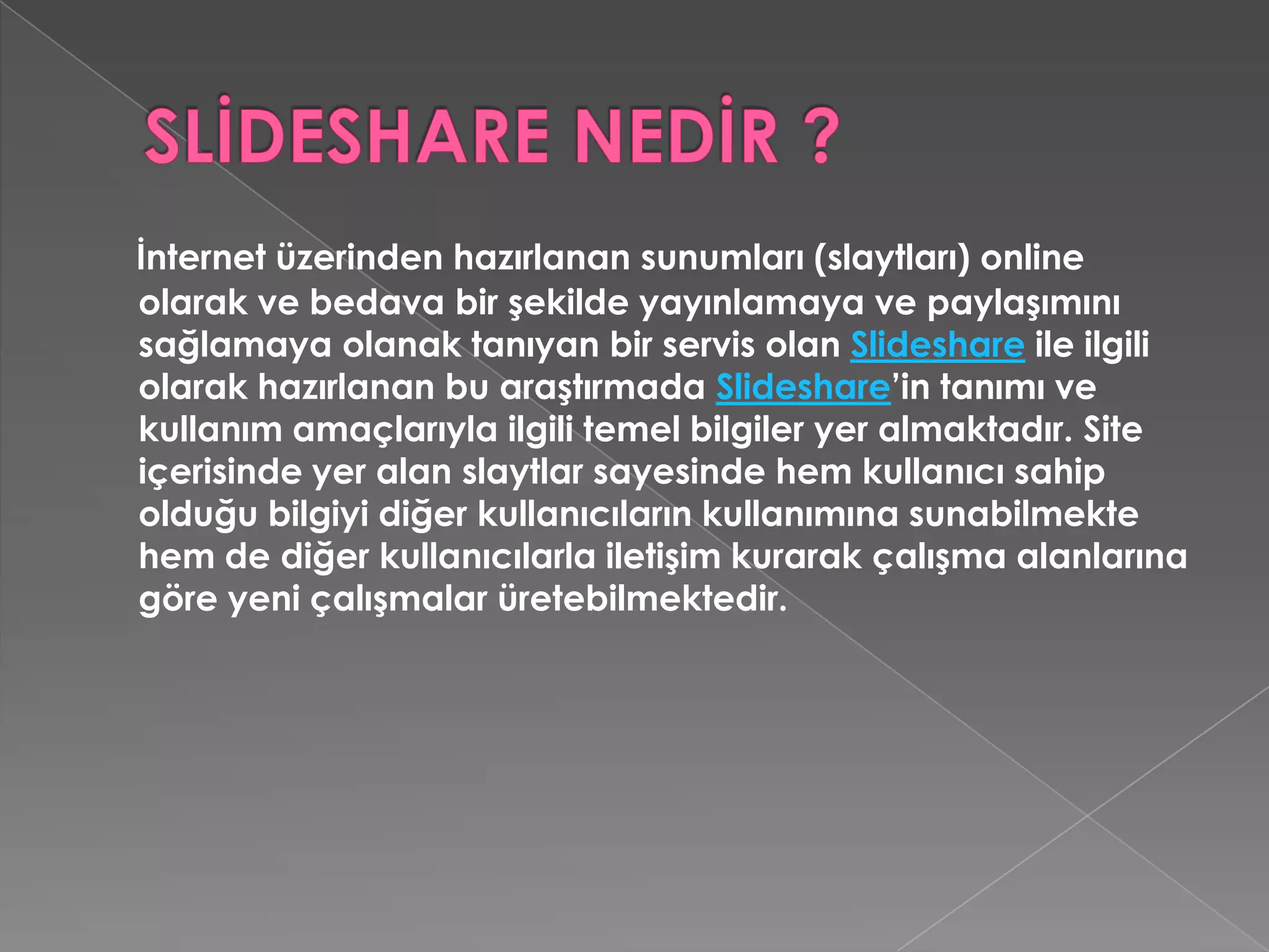 SLİDESHARE NEDİR ?İnternetüzerinden hazırlanan sunumları (slaytları) online olarak ve bedava bir şekilde yayınlamaya ve paylaşımını sağlamaya olanak tanıyan bir servis olan Slideshare ile ilgili olarak hazırlanan bu araştırmada Slideshare’in tanımı ve kullanım amaçlarıyla ilgili temel bilgiler yer almaktadır. Site içerisinde yer alan slaytlar sayesinde hem kullanıcı sahip olduğu bilgiyi diğer kullanıcıların kullanımına sunabilmekte hem de diğer kullanıcılarla iletişim kurarak çalışma alanlarına göre yeni çalışmalar üretebilmektedir.