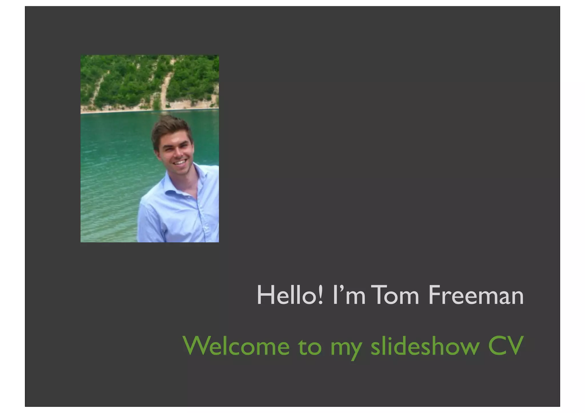 Tom Freeman introduces himself as a trainee occupational psychologist with a passion for applied evidence-based psychology. He summarizes his strengths as a love of learning, enthusiasm, and creativity. Freeman then outlines his education and career experiences, including an MSc in Occupational Psychology with Distinction and roles in student government and organizations. He expresses a desire to become a Chartered Occupational Psychologist and apply psychology in areas like stress, leadership, and organizational development.