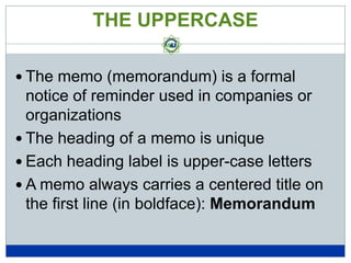 The document discusses the structure and formatting of memorandums. It states that memorandums are formal notices used within companies and organizations. They have a specific structure, which includes headings in all uppercase letters and labels for items like TO, FROM, DATE, SUBJECT. The main headings are MEMORANDUM, TO, FROM, DATE, SUBJECT, BODY. There is typically no signature line, but a signature may be written.