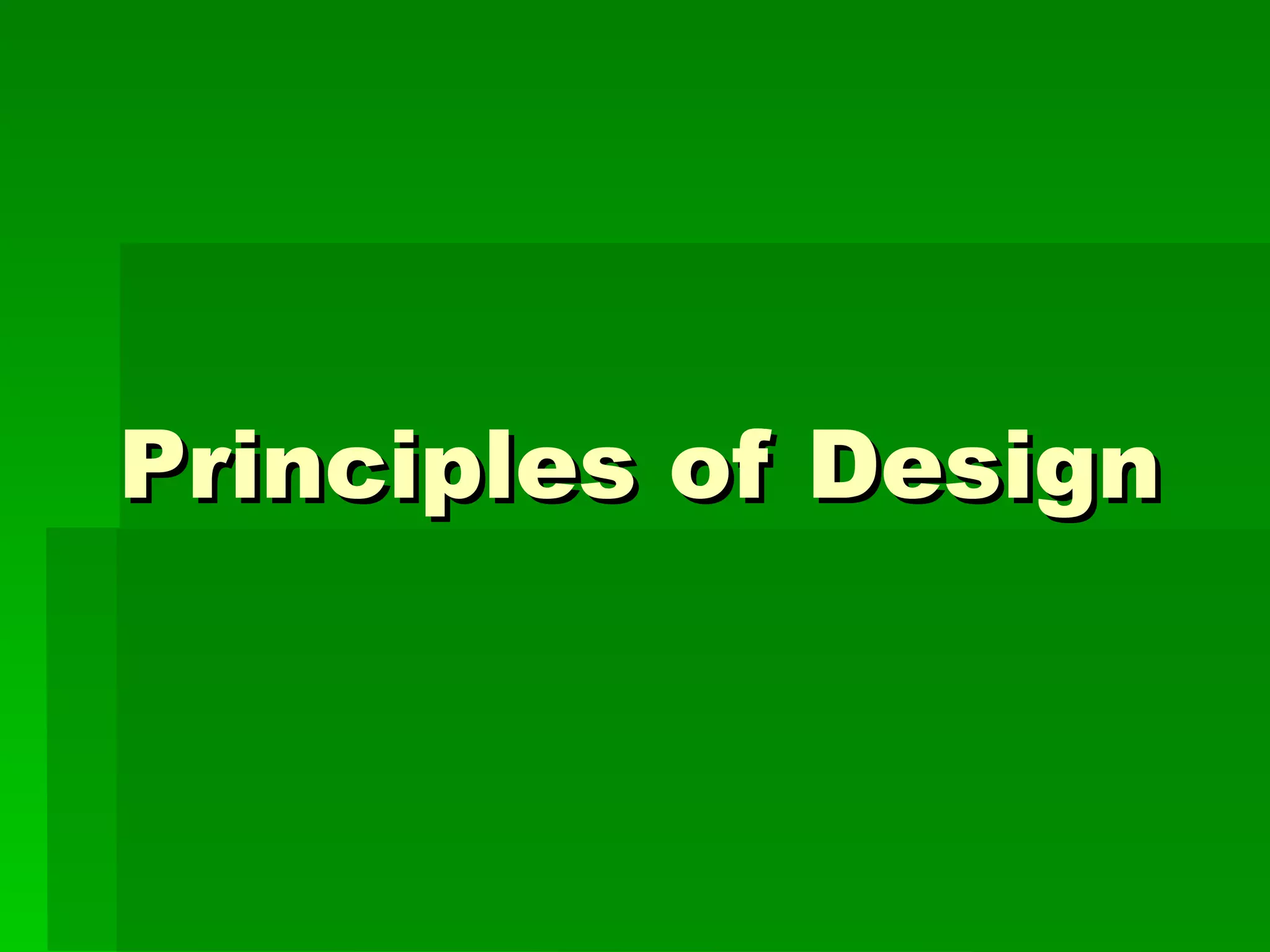 The document discusses several principles of design including balance, proportion, rhythm, emphasis, and unity. Balance refers to symmetrical or asymmetrical placement of elements. Proportion relates to the relative size of elements and their relationship. Rhythm creates movement through regular arrangement. Emphasis draws attention to focal points. Unity creates coherence and harmony among all design elements to achieve a common goal.